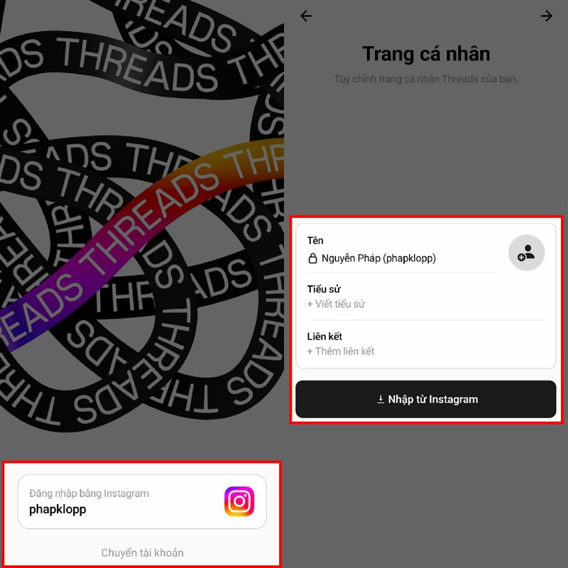 Bước 1: Sau khi tải và cài đặt thành công ứng dụng lên điện thoại của mình thì bạn hãy tiến hành mở ứng dụng. Ở giao diện đầu tiên, bạn sẽ được chọn tài khoản để đăng nhập. Bạn có thể sử dụng tài khoản Instagram chính đang sử dụng trên điện thoại để đăng nhập nhanh vào hệ thống hoặc ấn vào Chuyển tài khoản để sử dụng tài khoản khác của bạn. Khi đã đăng nhập thành công thì tiếp theo, bạn sẽ được điều chỉnh các thông tin như Tiểu sử và Liên kết. Điền xong tất cả thì bạn hãy chọn vào nút mũi tên ở góc trên bên phải màn hình.