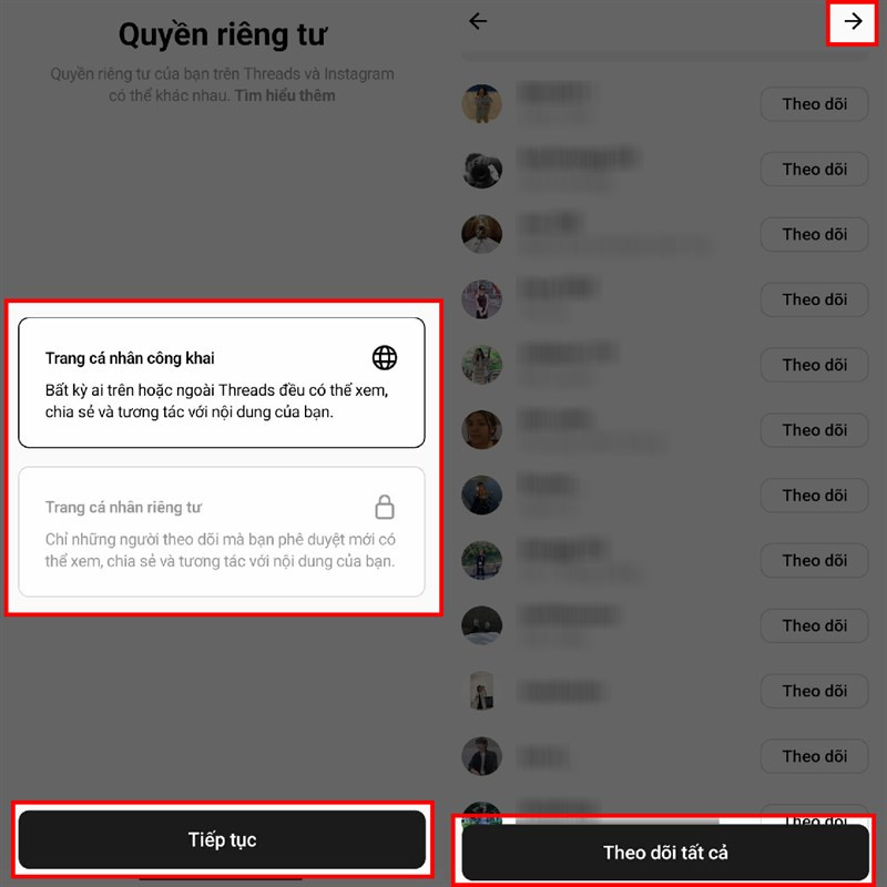 Bước 2: Tiếp theo là tùy chọn Quyền riêng tư của trang cá nhân là Công khai hay Riêng tư. Cũng dựa trên tài khoản Instagram thì bạn sẽ có thể theo dõi những người mà bạn đã theo dõi. Lựa chọn và ấn Theo dõi ở phía sau tên mỗi người hoặc ấn Theo dõi tất cả. Nhấn vào biểu tượng mũi tên đi tiếp ở góc trên bên phải màn hình để tiếp tục.