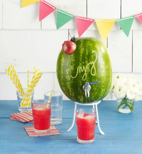 Cách này hơi mất công một chút: Bạn nạo hết dưa hấu sau đó xay lấy nước, rồi đổ lại vào vỏ quả, lắp một cái vòi và mở lấy nước bất cứ khi nào bạn muốn!