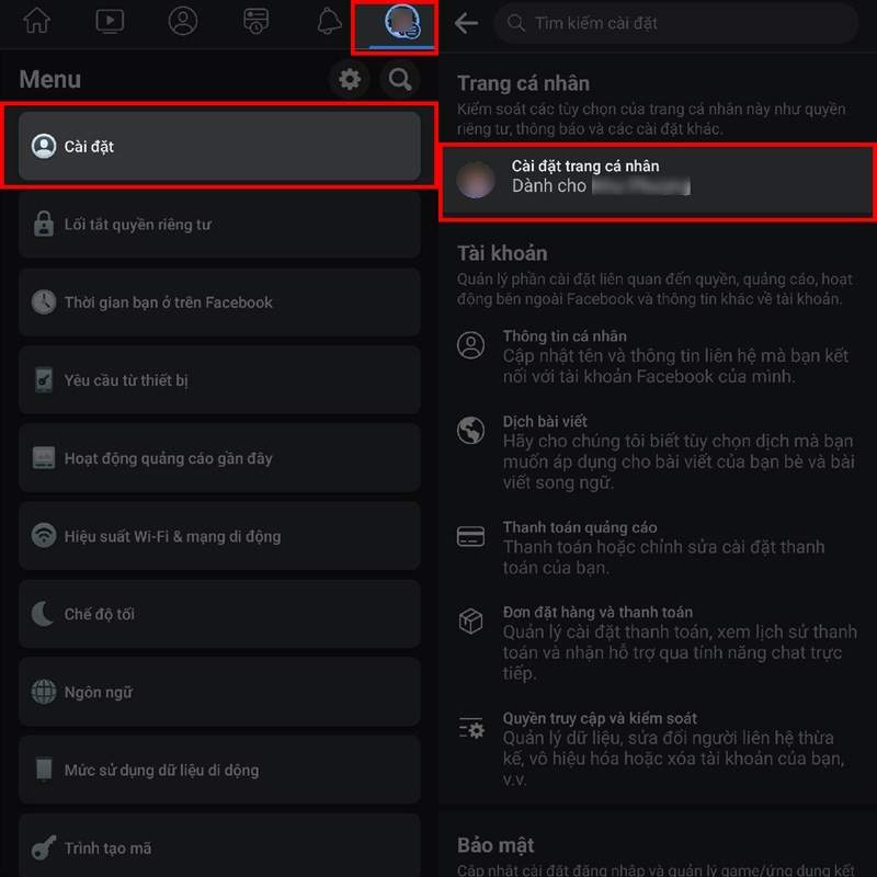 Bước 1: Đầu tiên, hãy mở ứng dụng lên và chọn ngay vào tab Menu có avatar của bạn > sau đó hãy vuốt xuống dưới cùng và tìm mục Cài đặt & quyền riêng tư > chọn tiếp Cài đặt > chọn Cài đặt trang cá nhân.