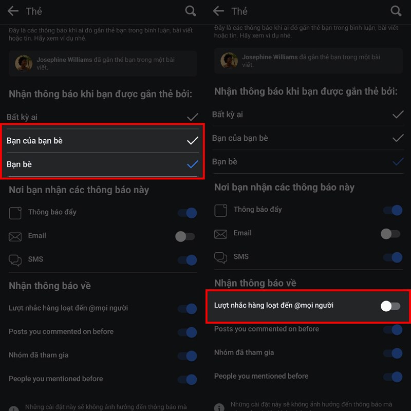 Bước 3: Tại đây bạn sẽ có các tùy chọn để tắt thông báo nêu bật khi có ai đó nhắc đến bạn trong các bài viết cũng như bình luận. Hãy chú ý đến mục Nhận thông báo khi bạn được gắn thẻ bởi, hãy tick vào mục Bạn bè hay Bạn của bạn bè tùy theo nhu cầu sử dụng để không phải bất kỳ ai cũng nhắc đến bạn được và đi cùng với đó ở mục Lượt nhắc hàng loạt đến @mọi người, tắt công tắc đó đi là xong.