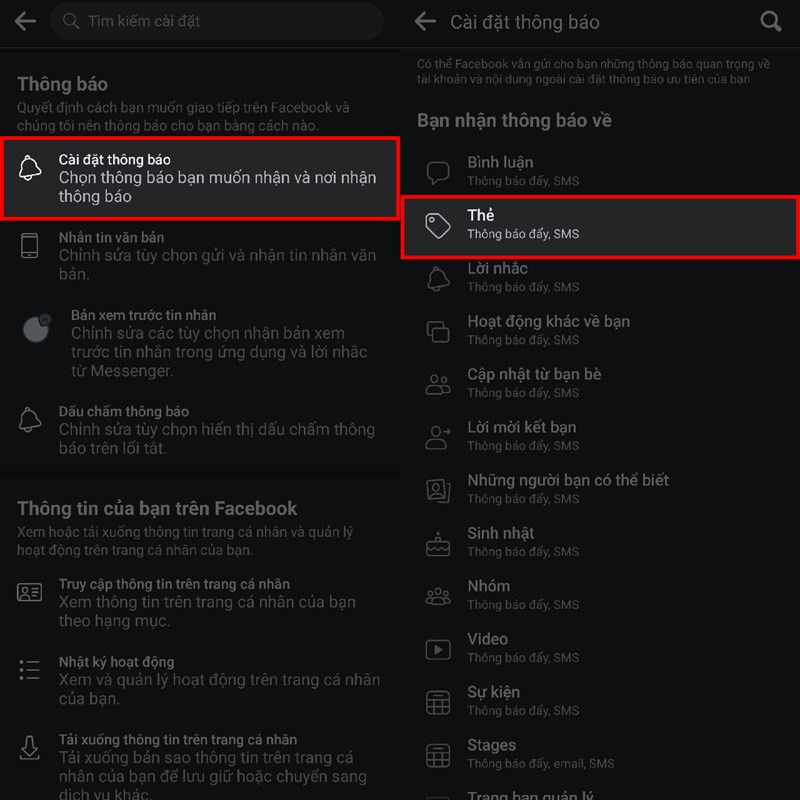 Bước 2: Và ở danh mục Thông báo thì bạn ấn vào mục Cài đặt thông báo để tiếp tục. Các thông báo nêu bật là khi có người khác tag bạn thì bạn sẽ nhận được thông báo. Vì vậy hãy tìm và chọn tiếp vào mục Thẻ.