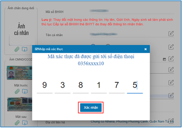 Sau khi cập nhật các thông tin cần thay đổi hoặc bổ sung, nhập mã kiểm tra rồi nhấm "Ghi nhận". Nhập mã OTP gửi về số điện thoại đã đăng ký, nhấn "Xác nhận".