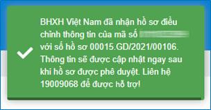Gửi hồ sơ thay đổi thông tin thành công hệ thống hiển thị thông báo như hình dưới: