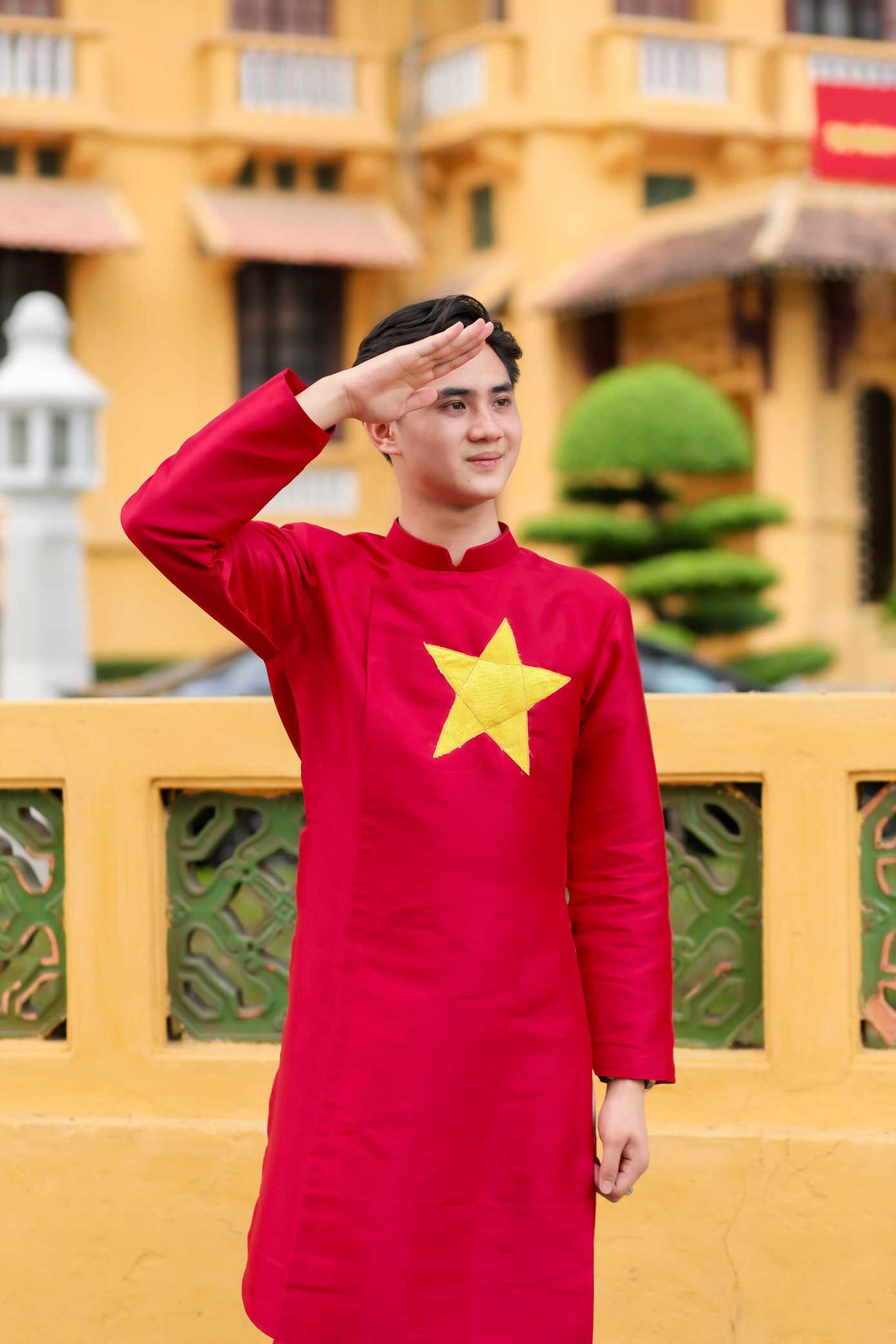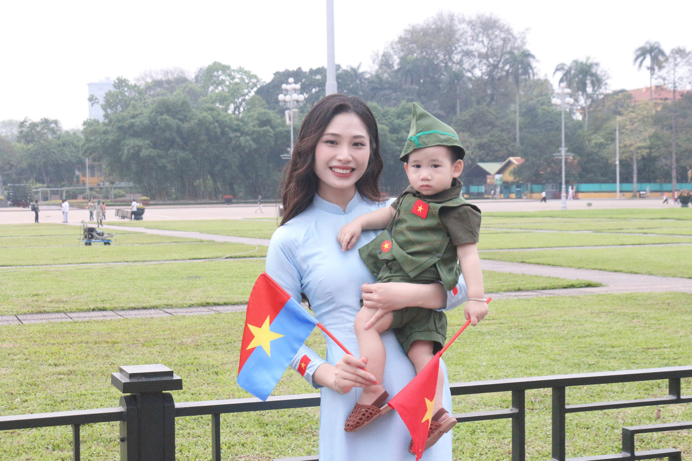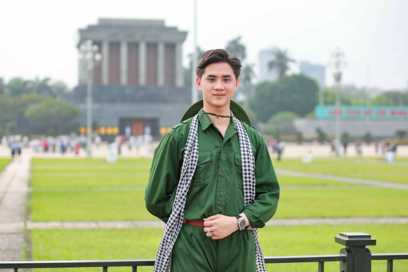 | Tuấn Anh trong trang phục bộ đội Cụ Hồ tại di tích Lăng Chủ tịch Hồ Chí Minh. |