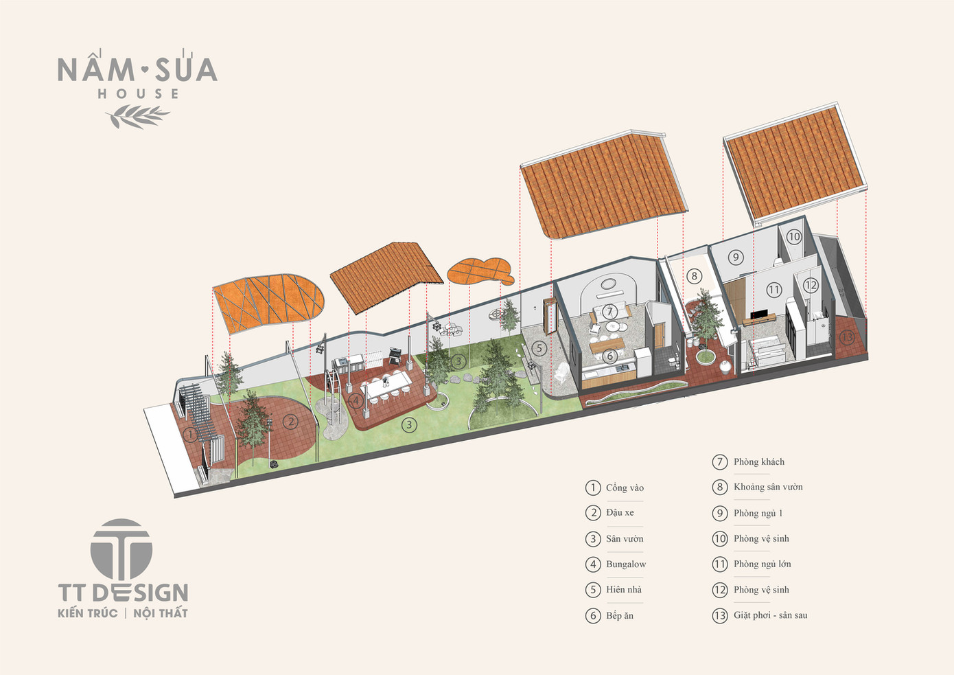 Ngôi nhà chia làm 3 phần chính là sân vườn phía trước, khu chức năng chung, sân trong và khu chức năng riêng tư.