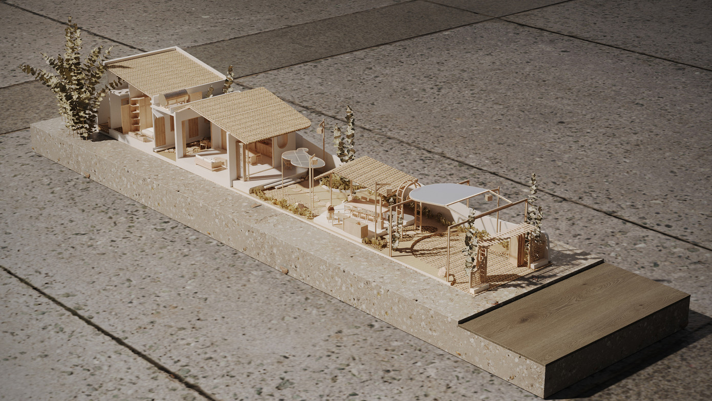 Thiết kế đẩy lùi khối nhà về phía sau, từ cổng đi vào là sân để xe, vườn cây và bungalow là nơi gia chủ dành cho các sinh hoạt trải nghiệm như làm vườn, uống cà phê hoặc những buổi BBQ ngoài trời vào dịp lễ, cuối tuần cùng con cái, người thân, bạn bè.