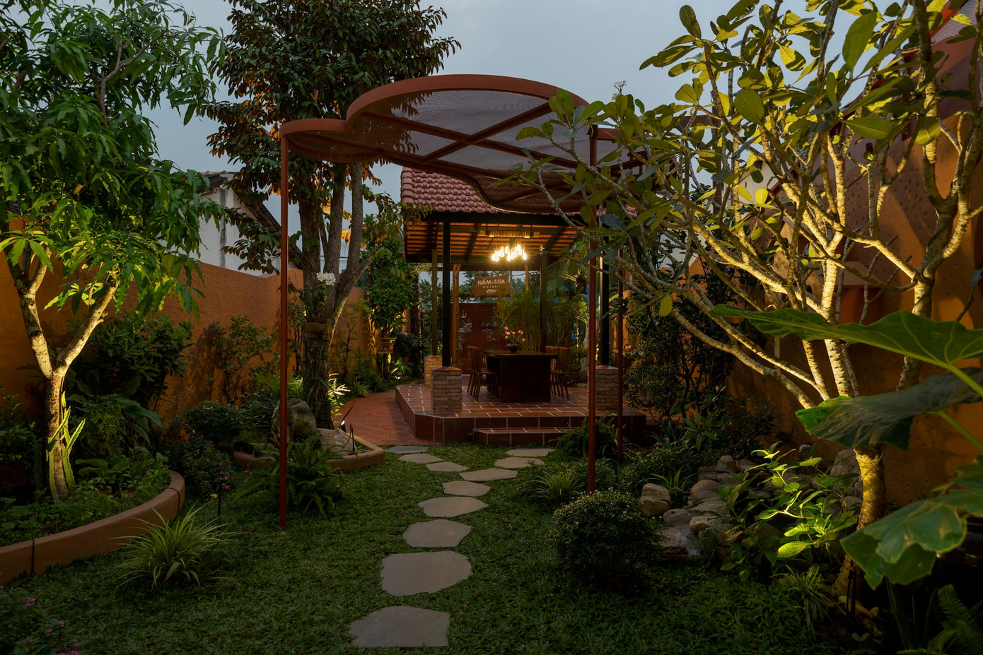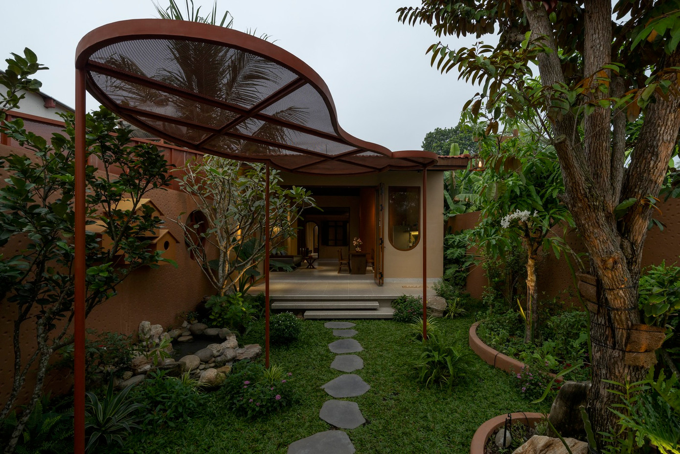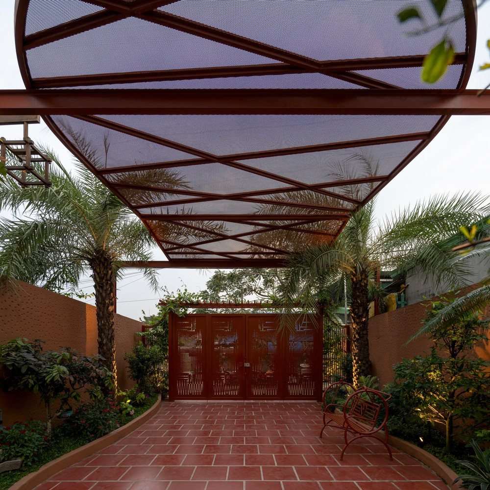 Do diện tích hẹp ngang, khu sân vườn được bố trí cây xanh hai bên, đường lót đá dẫn lối và các mái che cách điệu làm điểm nhấn.