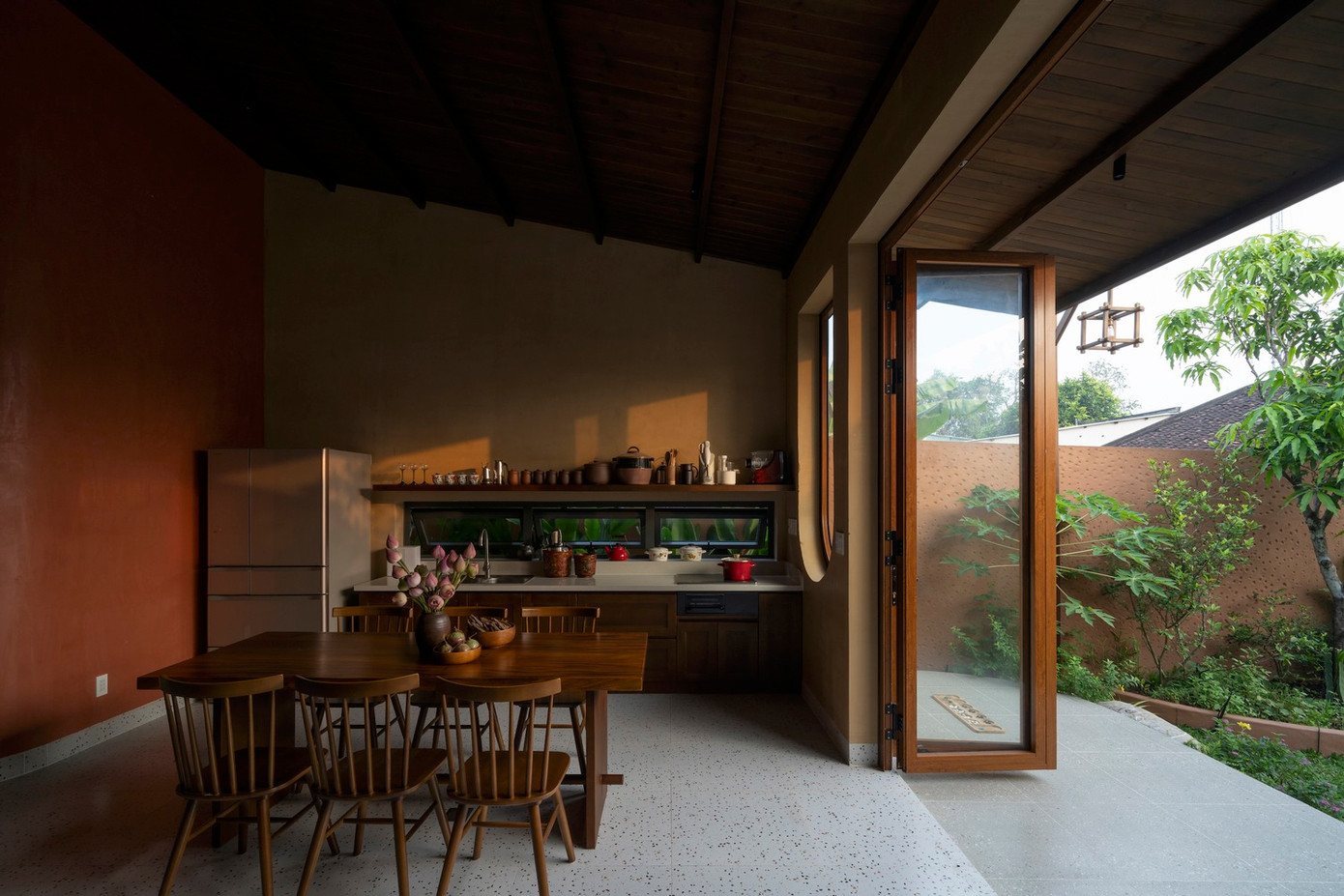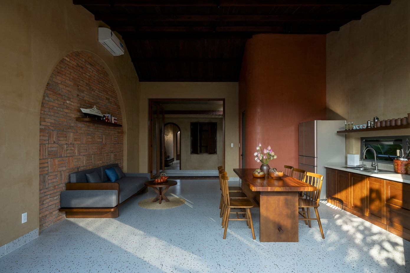 Khu chức năng chung được thiết kế đơn giản với hình ảnh gợi nhớ về nếp nhà truyền thống như tường gạch mộc, nội thất gỗ, chum vại ở khu bếp.
