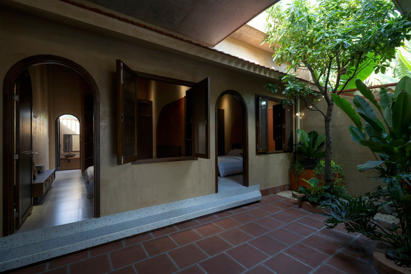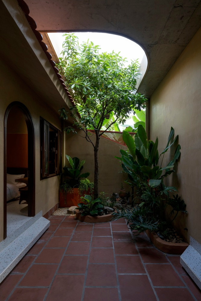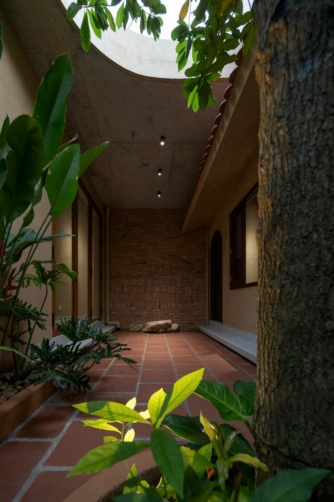 Trở thành vùng đệm phân tách giữa hai khu chức năng chung - riêng, sân trong mở thêm giếng trời để lấy sáng và trồng thêm cây xanh để tạo mát, thanh lọc không khí, ngăn tiếng ồn từ khu sinh hoạt chung vào các khu phòng nghỉ.