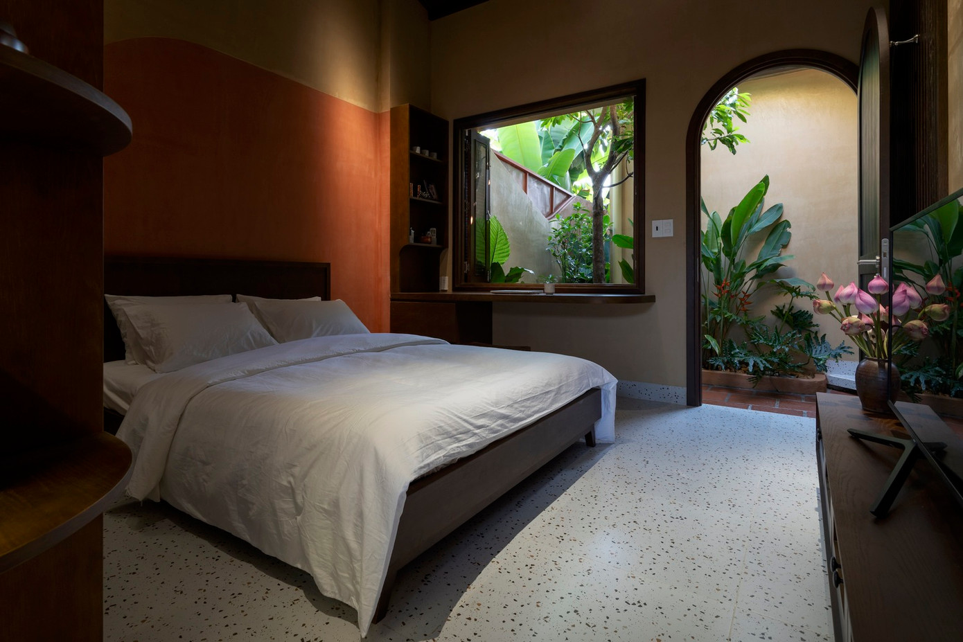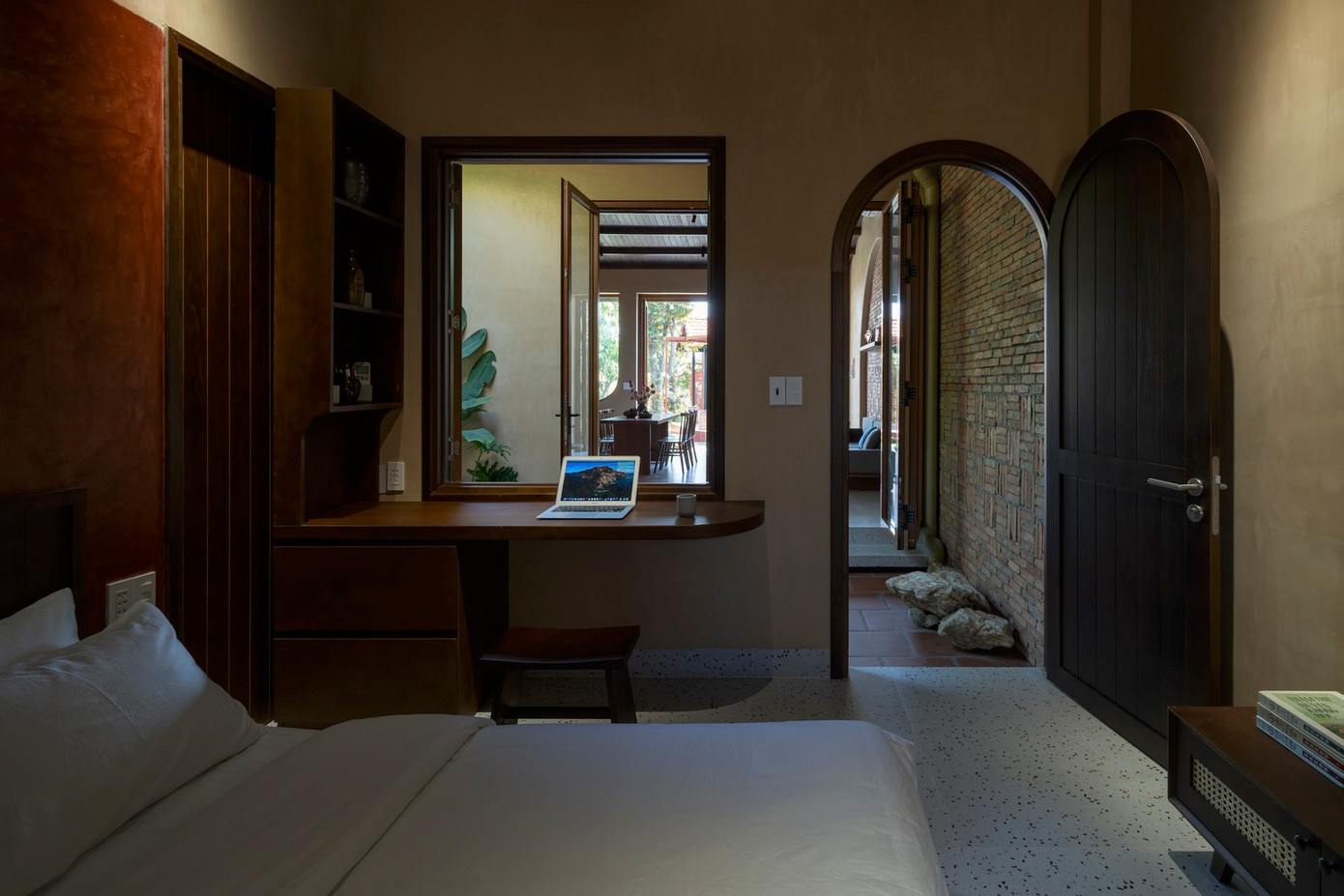Khu riêng tư gồm 2 phòng ngủ, 2 nhà vệ sinh và khu giặt ủi. Để đảm bảo tính xuyên suốt đồng nhất trong thiết kế: màu sắc, chất liệu và hình ảnh đều mang cảm hứng từ nếp nhà truyền thống đem lại cảm giác dung dị ấm cúng.