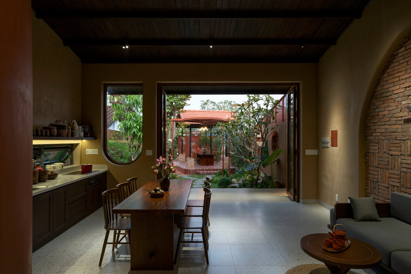 Tiếp nối khu sân vườn, con đường lót đá dẫn vào khối nhà, khu chức năng chung bao gồm phòng khách, khu bếp và bàn ăn.