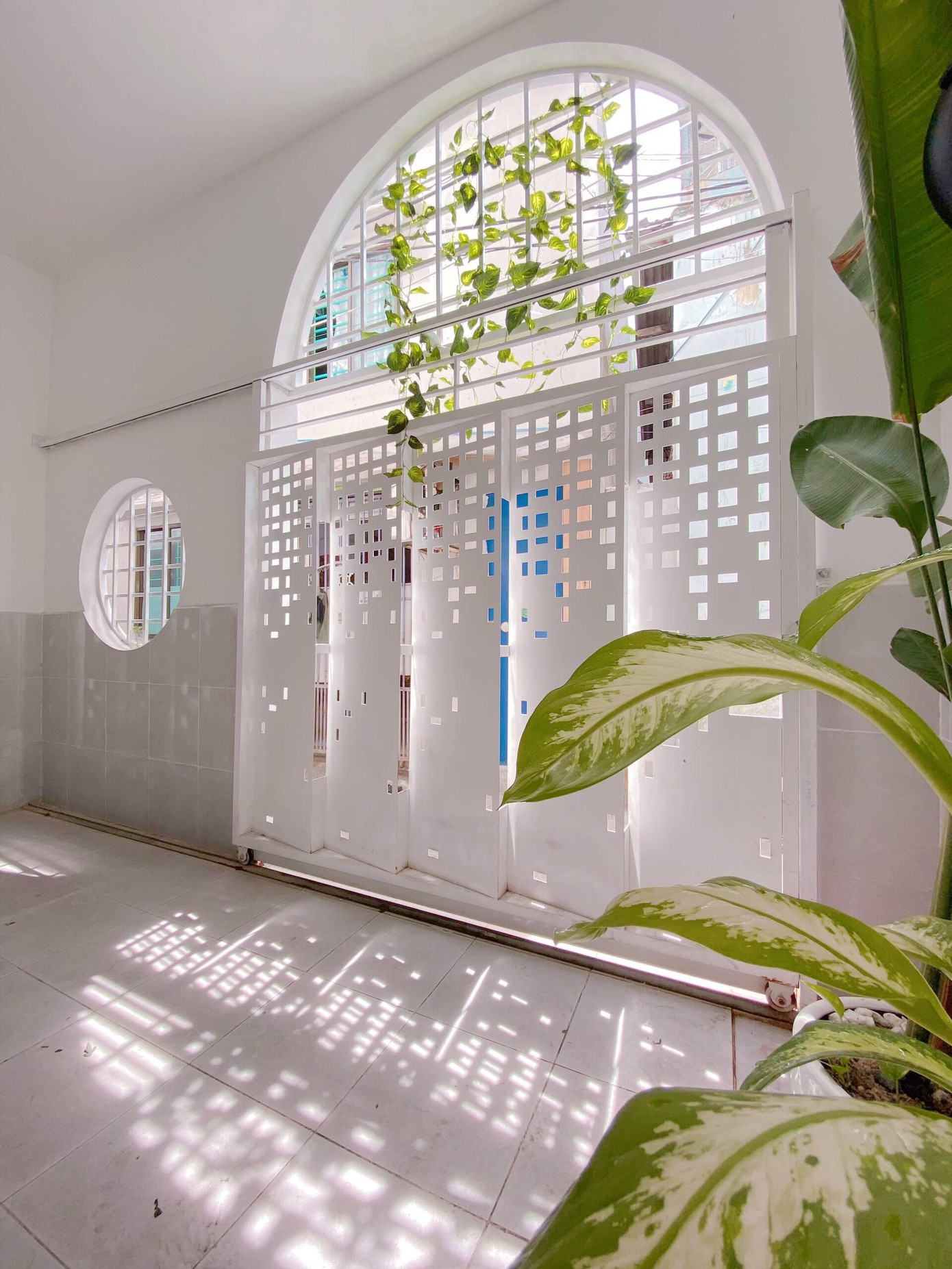 | Để ngôi nhà đỡ nhàm chán về mặt thị giác, KTS lắp đặt ô cửa sổ tròn ở mặt tiền để tạo điểm nhấn. Cửa chính là dạng cửa sắt ray trượt, cánh cửa được khoét những ô vuông, chữ nhật to nhỏ khác nhau để không khí, nắng, gió vẫn “ra vào” nhà được. |