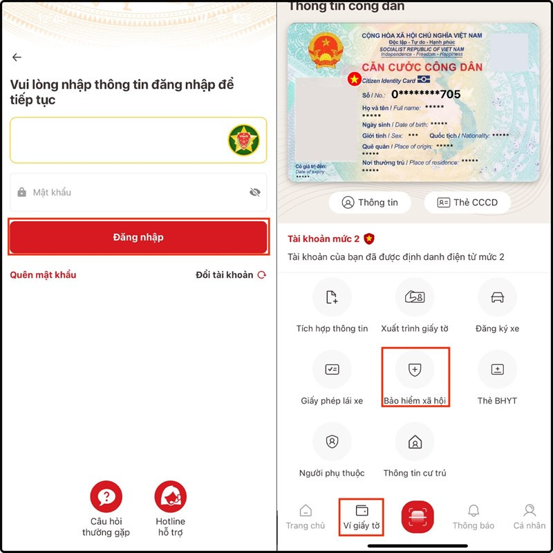 Bước 1: Đầu tiên, bạn hãy mở ứng dụng VNeID trên điện thoại của bạn > sau đó bạn hãy điền số CCCD và mật khẩu > tiếp theo bạn hãy bấm vào nút đăng nhập phía bên dưới > sau đó nữa thì bạn hãy bấm chọn vào ví giấy tờ > kế tiếp bạn hãy bấm chọn vào mục bảo hiểm xã hội.