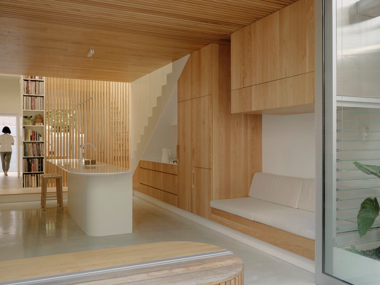 | Dưới giếng trời là cầu thang, do diện tích eo hẹp nên các bậc cầu thang còn là ngăn tủ chứa sách, cầu thang trở thành nơi đọc sách lí tưởng cho người ở. |