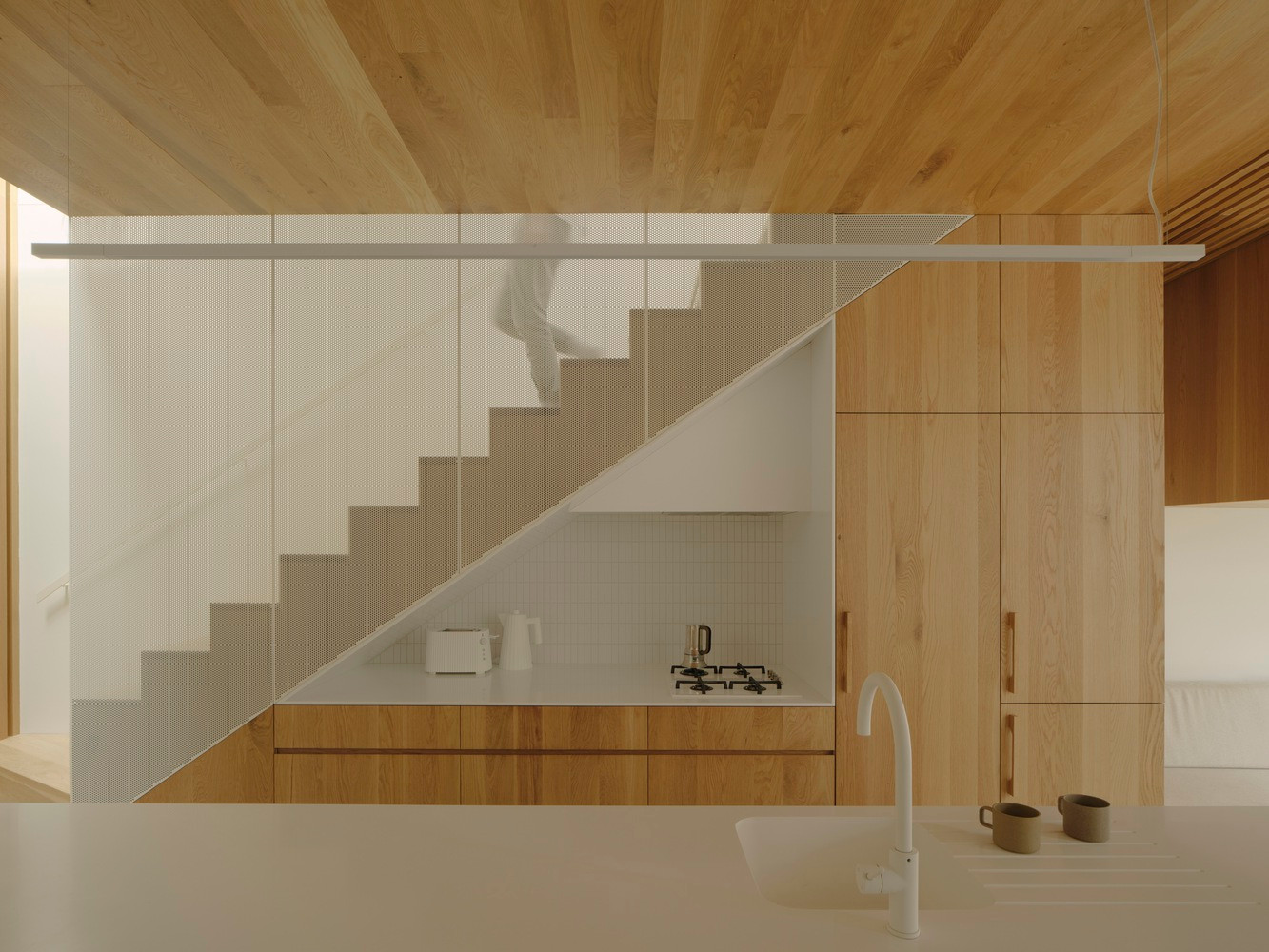 | Do diện tích nhỏ hẹp nên diện tích gầm cầu thang được tận dụng làm bếp và tủ đựng đồ. |