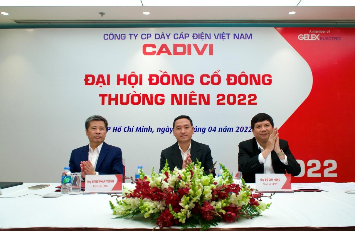Đại hội thường niên 2022 của CADIVI cũng đã bầu Hội đồng quản trị Công ty nhiệm kỳ 2022-2027, gồm các Ông: Ông Nguyễn Văn Tuấn, Ông Lê Quang Định, Ông Đặng Phan Tường, Ông Đỗ Duy Hưng, Ông Phan Ngọc Hiếu. HĐQT CADIVI cũng đã thống nhất bầu ông Nguyễn Văn Tuấn tiếp tục giữ chức danh Chủ tịch HĐQT tại phiên họp đầu tiên sau Đại hội.