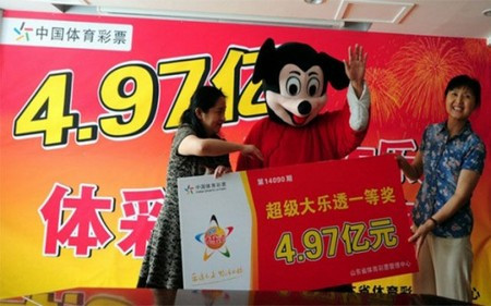 Tháng 8 năm ngoái, một người đàn ông khác cũng mặc bộ trang phục chuột Mickey để đi nhận giải thưởng xổ số trị giá 398 triệu Nhân Dân Tệ.