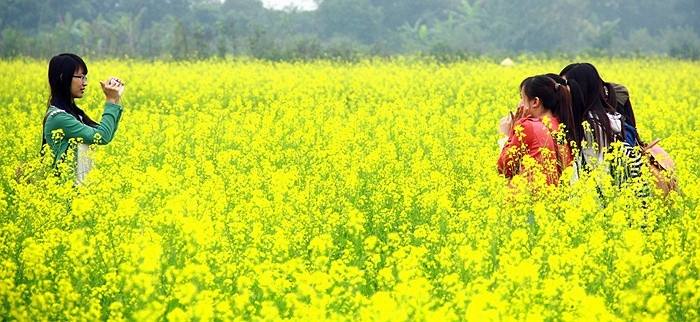 | Với vẻ đẹp quyến rũ mà giản dị, hoa cải vàng thu hút rất nhiều bạn trẻ tới tham quan và chụp ảnh. |