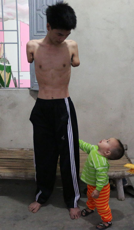 Thật không cầm được nước mắt khi người cha trẻ cụt đôi tay ngồi trên chiếc chõng tre, dùng đôi chân thương tật cố giữ cho đứa con trai bé bỏng không té ngã xuống sàn nhà. Đứa con trai có lẽ đã quá đói, bà nội chưa kịp pha sữa, cứ khóc thét liên hồi.