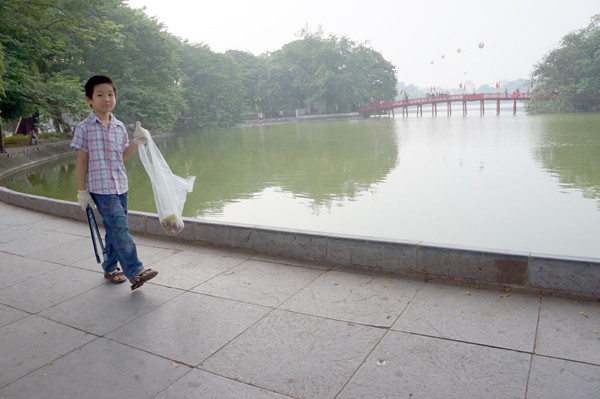 | Một em nhỏ của nhóm nhặt rác bên hồ Gươm. Ảnh: Minh Đức |