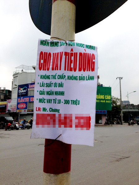 Nếu như trước đây, dịch vụ cho vay vốn kiểu này tiếp cận khách hàng bằng tờ rơi quảng cáo, tin nhắn qua điện thoại, gốc cây, cột điện, thì nay để thu hút sự chú ý hơn, chúng được treo chủ yếu tại các cột đèn, biển báo giao thông. Chủ nhân của những tờ quảng cáo này hy vọng người người tham gia giao thông, do có tâm lý sốt ruột khi chờ đèn đỏ, sẽ nhìn đồng hồ đếm ngược tại các ngã tư. Khi đó, họ sẽ để ý hơn tới những mẩu quảng cáo rao vặt.