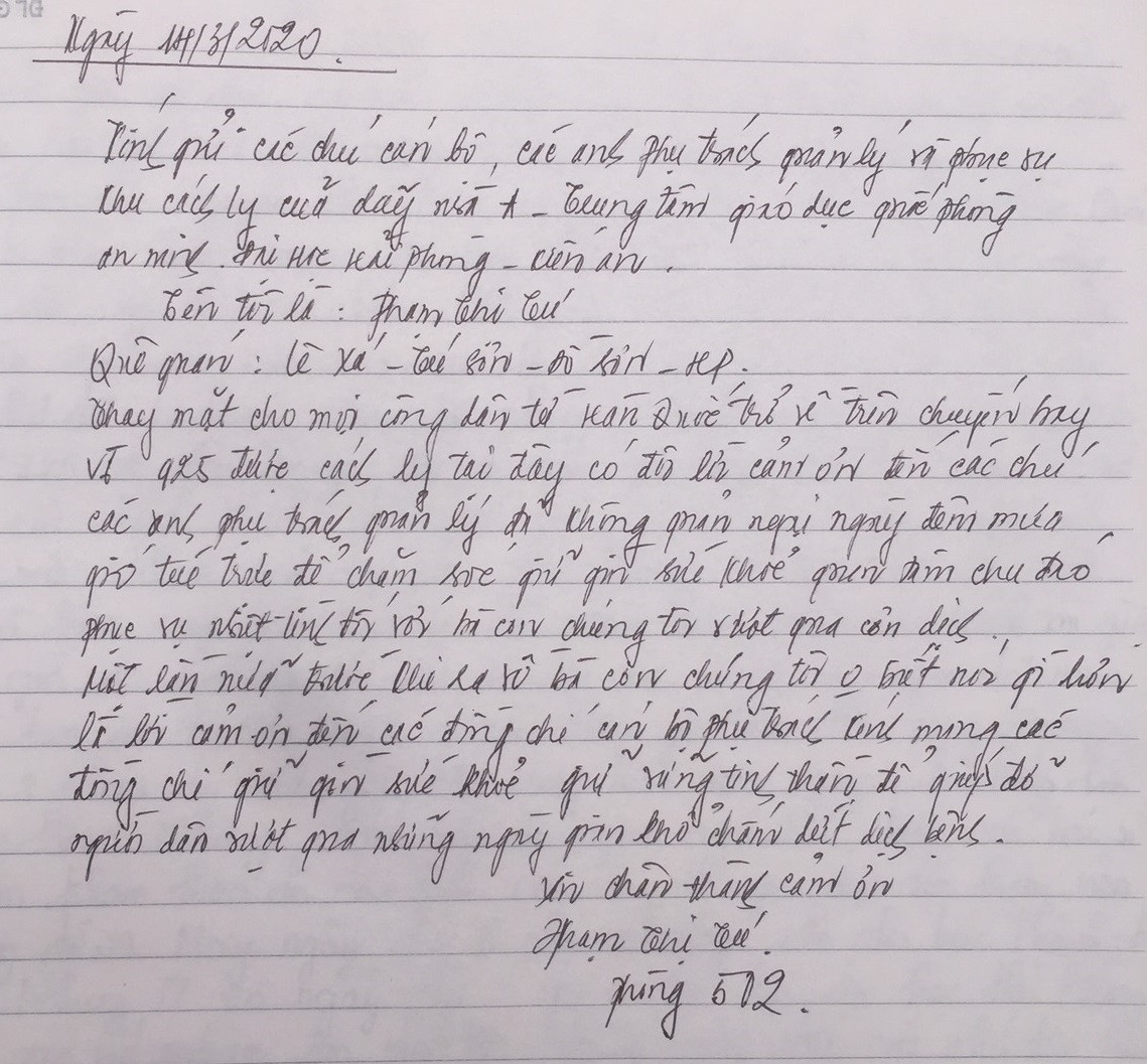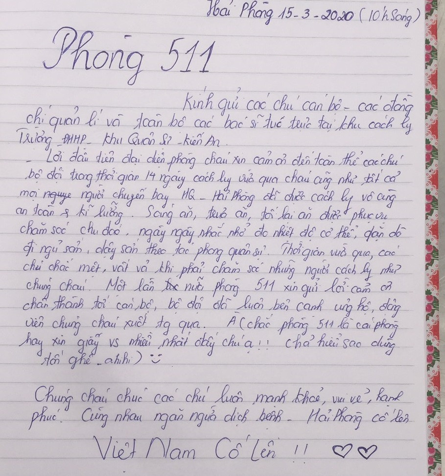 "Vậy là 14 ngày cách ly đã sắp trôi qua, chúng cháu xin gửi lời cảm ơn đến mọi người đã giúp đỡ trong suốt những ngày qua. Từ ngày mai, mỗi người trong khu cách ly này sẽ quay lại với cuộc sống thường ngày nhưng sẽ không bao giờ quên được thời gian này. Chúc các chú, đội ngũ y tế và gia đình luôn khỏe mạnh, vui vẻ và hạnh phúc. Hẹn gặp lại mọi người vào dịp khác." - Lời cảm ơn của các công dân tại phòng 509 khu cách ly tập trung gửi gắm tới lực lượng thực hiện nhiệm vụ tại đây.