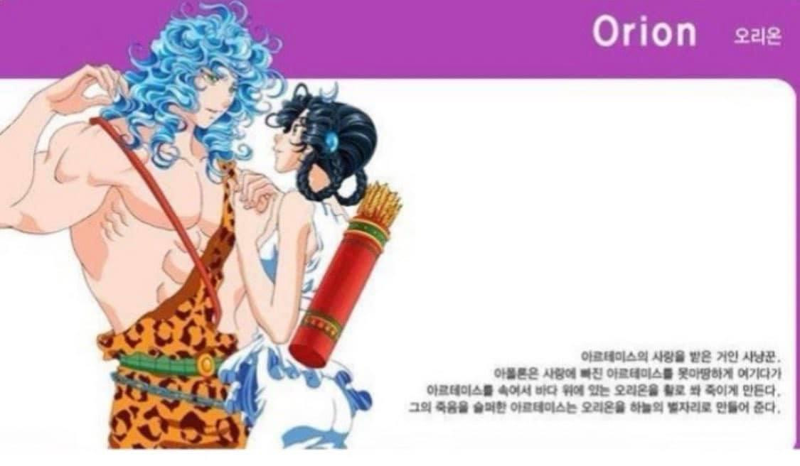 Theo đó, mối tình của Artemis và Orion đã tan vỡ vì anh trai của thần Artemis - thần ánh sáng, chân lý Apollo ngăn cản để bảo vệ sự thuần khiết, trong trắng vĩnh hằng của nữ thần. Chỉ khi nàng bắn mũi tên bạc trúng một vật nổi trên mặt biển, nam thần mới cho phép Artemis thành đôi cùng Orion. Không may, Artemis đã hoàn thành nhiệm vụ mà không biết rằng thứ mình vừa bắn trúng chính là đầu của Orion.