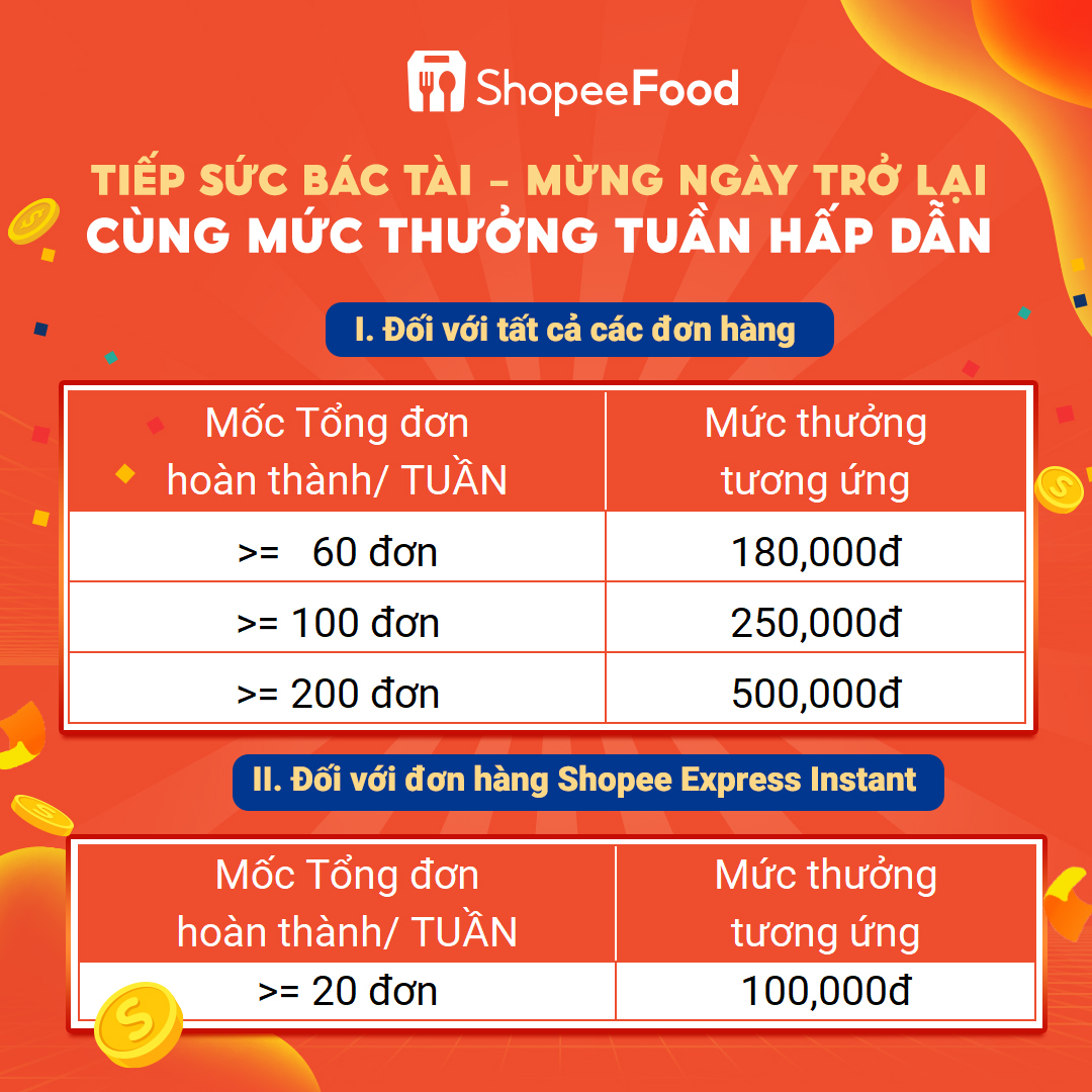 Hiện nay, ShopeeFood đã bắt đầu mở lại các dịch vụ ở TP. Hồ Chí Minh, Đà Nẵng, Hà Nội... Để tiếp thêm động lực cho hàng nghìn Đối tác Tài xế yên tâm và tăng cường hoạt động trong giai đoạn dịch Covid-19, ShopeeFood liên tục cập nhập nhiều chính sách với mức thưởng và các ưu đãi cạnh tranhnhằm cải thiện thu nhập cho Tài xế. Điển hình, từ 16/9, ShopeeFood đã bắt đầu triển khai “Tiếp Sức Bác Tài - Mừng ngày trở lại” với mức thưởng tuần hấp dẫn lên đến 600,000 VNĐ/tuần áp dụng cho từ 60 đơn hàng trở lên. Bên cạnh đó, Tài xế cũng được “Hỗ trợ khoản phạt vi phạm hành chính” ở mức hỗ trợ tối đa 2,000,000 VNĐ/Tài xế đang hoạt động trong thời gian giãn cách đã thực hiện theo đúng hướng dẫn của ShopeeFood và các quy định do Cơ quan chức năng tại từng địa phương ban hành.