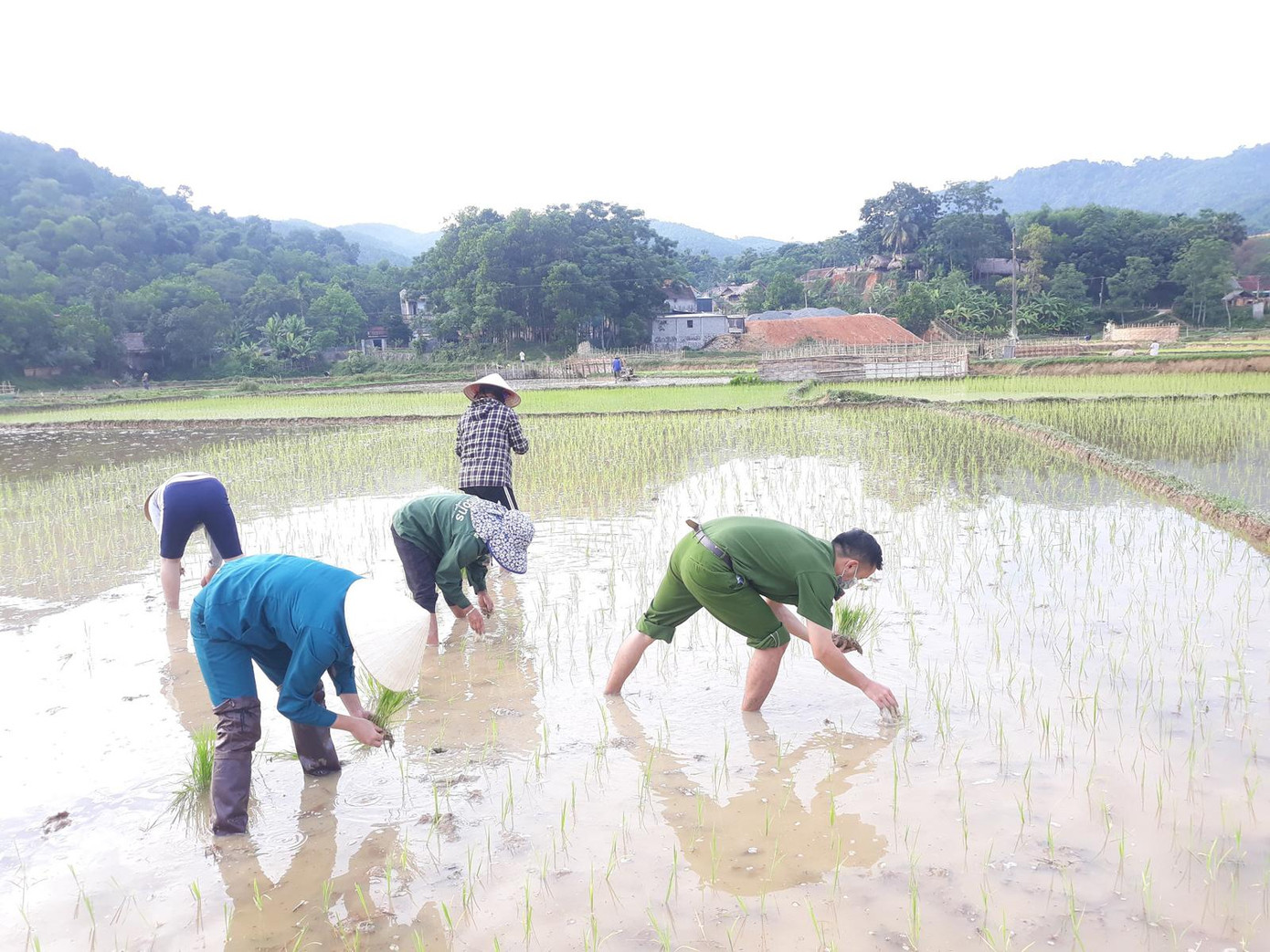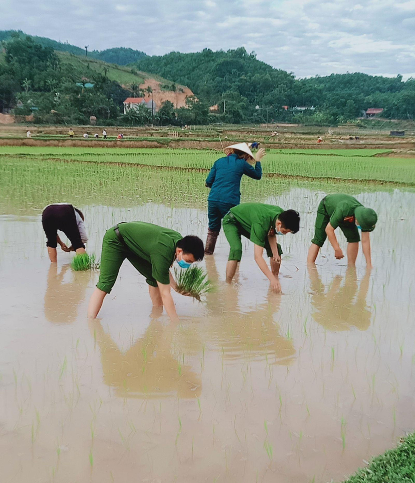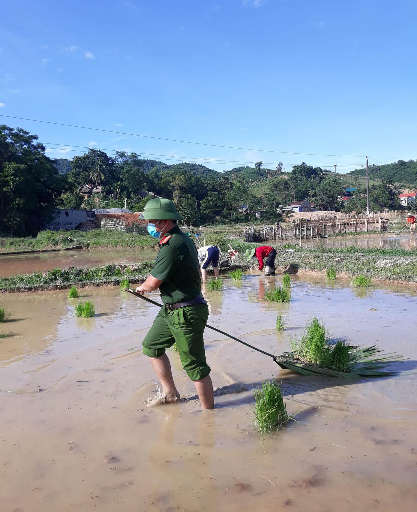 Hiểu được nỗi lo lắng đó, cán bộ chiến sỹ công an được tăng cường phòng, chống dịch COVID-19 đã phối hợp với công an xã Vạn Xuân, Hội Liên hiệp phụ nữ xã và Xã đội không quản ngại khó khăn, vất vả dưới thời tiết nắng nóng như đổ lửa, tổ chức xuống đồng cấy lúa giúp dân.