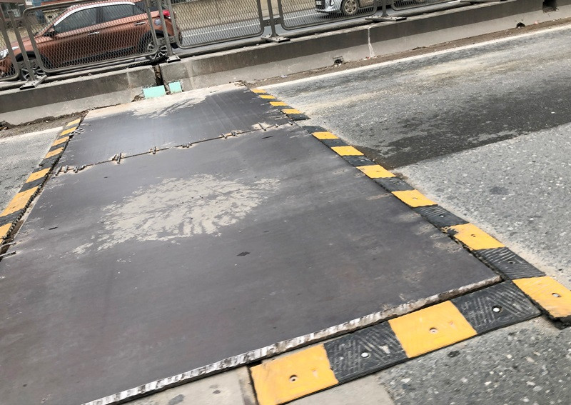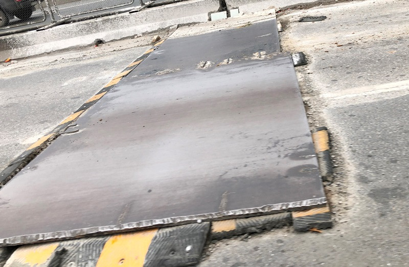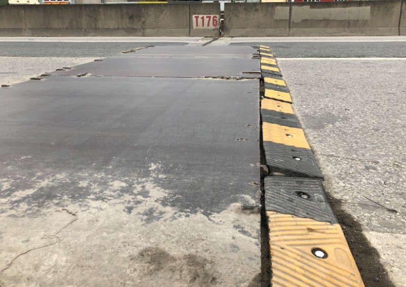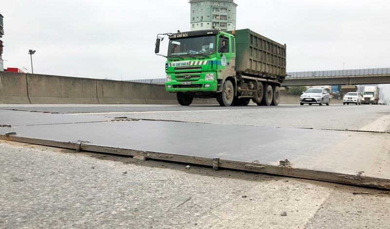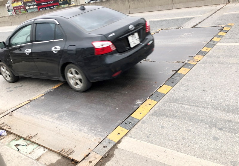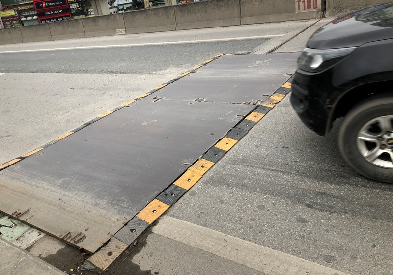 Tại công trường đang thi công sửa chữa các khe co giãn, hầu hết các tấm tôn đậy công trường để phương tiên đi lại thuận lợi đã được nhà thầu bỏ việc dùng đinh neo vít xuống đường. Thay vào đó xung quan tấm tôn đã được bịt bằng các thanh cao su cứng.