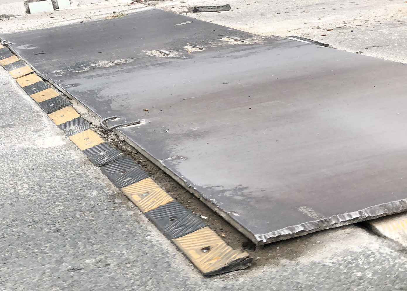 Cụ thể, thay vì dùng đinh neo vít xuống đường để giữ các tấm tôn được đậy trên bề mặt công trường, từ nay việc thi công tại đây được đổi sang phương án là dùng gờ giảm tốc cao su lắp đặt bốn xung quanh để giữ tấm tôn. Phương án này hiện đang đươc triển khai ở hiện trường.