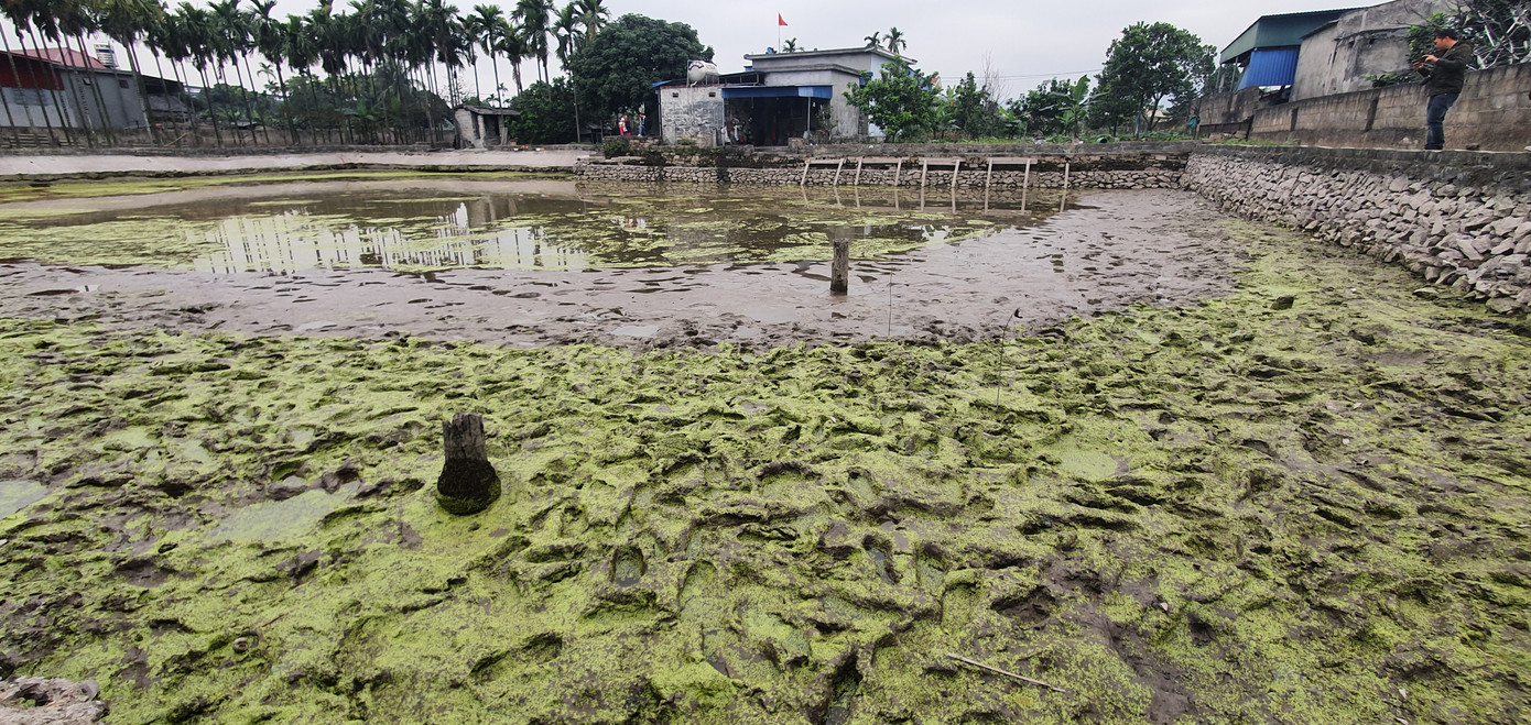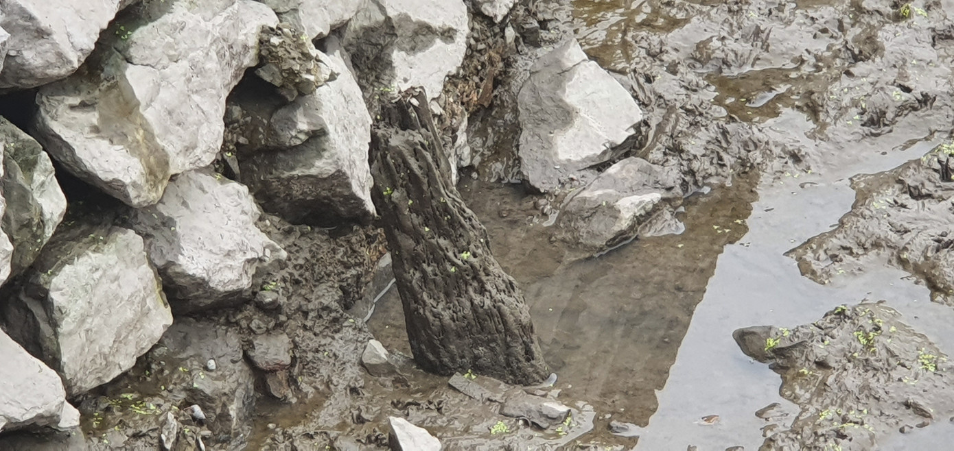 Trong số 13 cọc phát lộ có 3 cây cọc nằm thẳng đứng, nhô lên cao khoảng 20 – 30cm so với mặt bùn đáy ao.