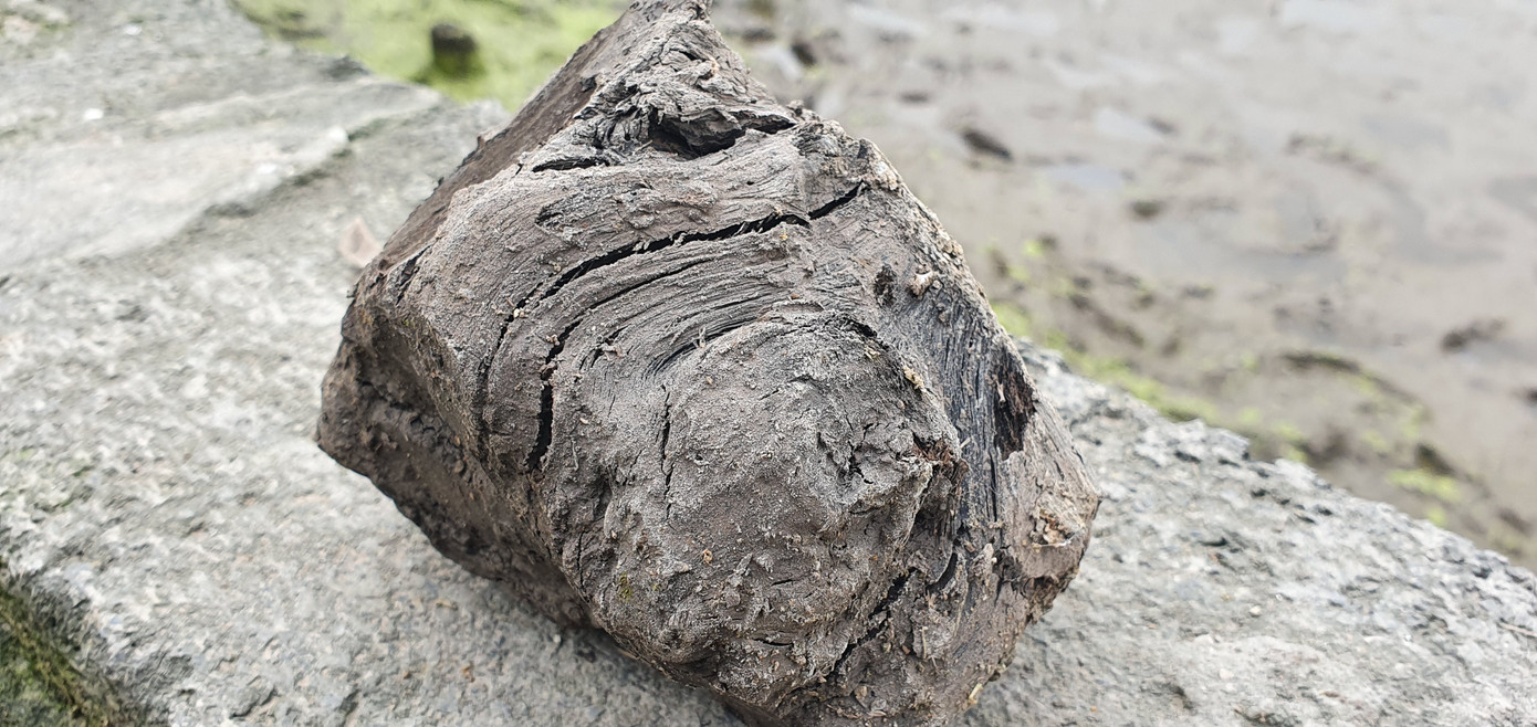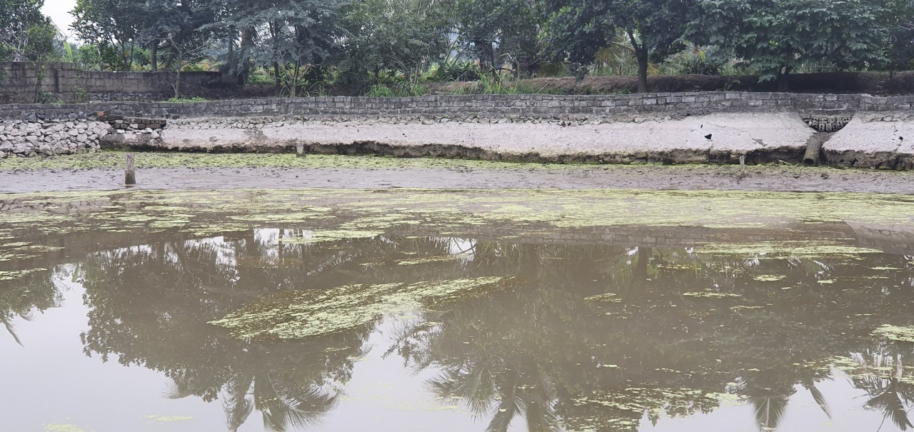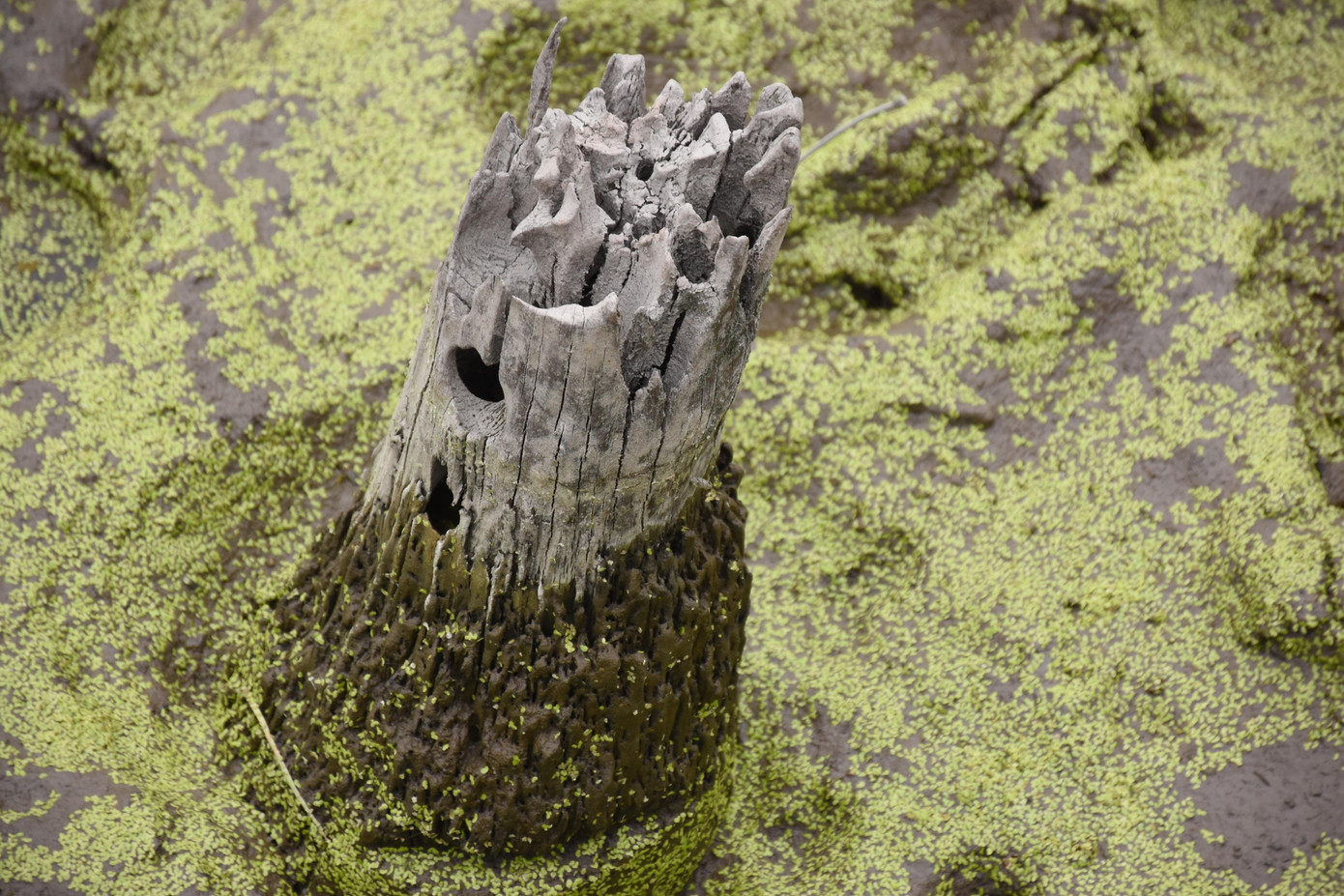 Một cây cọc gỗ có kích thước lớn nằm trong bờ kè đá thành ao.