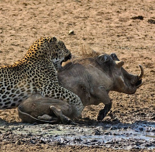 Với chiếc nanh uốn cong của mình, con lợn nanh sừng châu Phi nhiều lần định húc thủng vòm họng của báo đốm nhưng không may cho nó, báo đốm thực sự là một tay săn mồi lão luyện.