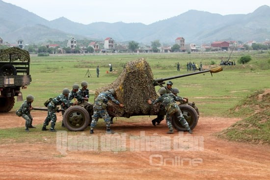 Thiếu tướng Nguyễn Hữu Chí, Phó tư lệnh Quân chủng PK-KQ cho biết, tác chiến trong chiến tranh hiện đại luôn đặt ra yêu cầu mới cho bộ đội PK-KQ, trong đó có pháo phòng không. Bởi vậy, việc tổ chức diễn tập bắn đạn thật vừa đưa bộ đội sát với thực tế chiến đấu, vừa làm cơ sở để quân chủng đánh giá trình độ, chất lượng huấn luyện và khả năng SSCĐ của bộ đội pháo phòng không, từ đó có biện pháp tổ chức huấn luyện hiệu quả hơn. Ảnh: Sau khi chiếm lĩnh trận địa, các pháo thủ khẩn trương cố định pháo...