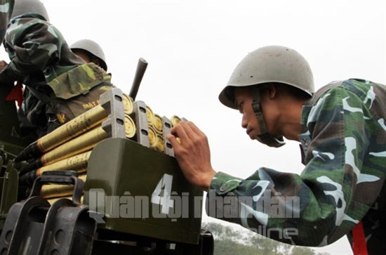 Một số điểm mới trong diễn tập bắn đạn thật pháo phòng không năm nay là đội hình máy bay mục tiêu bay vào 3-4 chiếc, thay vì một chiếc như những lần trước đây, đòi hỏi các đơn vị cũng như các khẩu đội pháo phòng không phải có phương án chính xác nhất trong lựa chọn để bắn đúng, trúng mục tiêu. Bên cạnh đó, trong bắn đêm, mục tiêu xâm nhập vào hướng trận địa không bật đèn, đòi hỏi bộ đội pháo phòng không phải sử dụng ra-đa để bắt, bám sát, bắn trúng và tiêu diệt mục tiêu. Ảnh: Đưa đạn pháo vào kẹp băng.