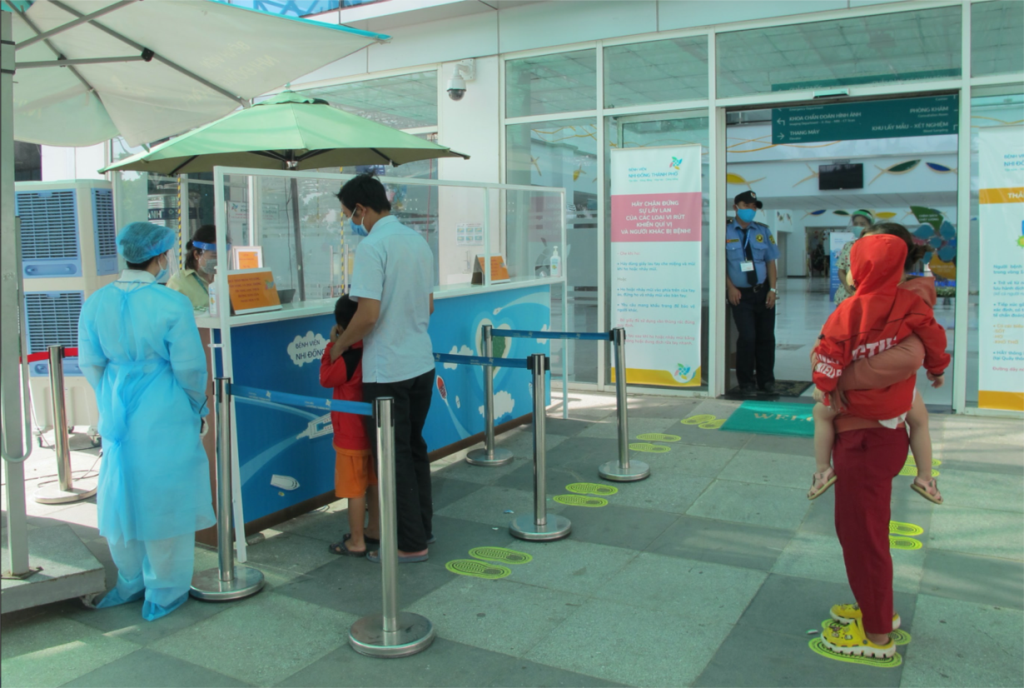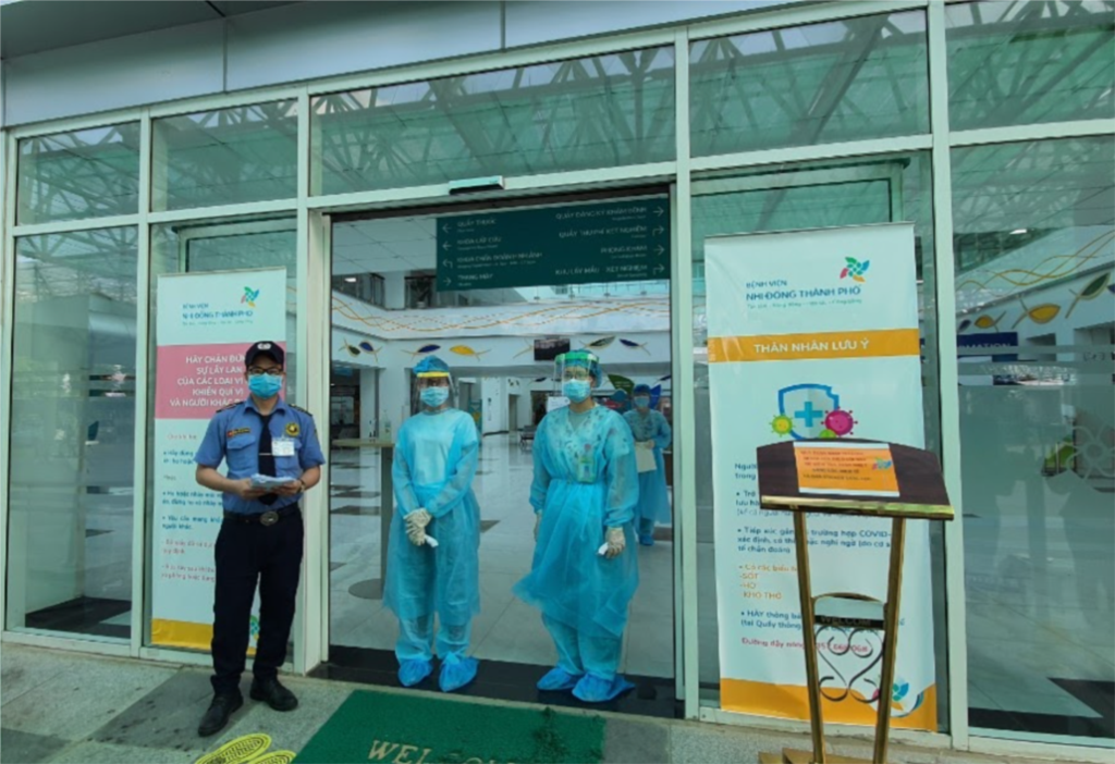 Nhân viên chuyên trách công tác hướng dẫn và kiểm soát tất cả mọi người đến BV Nhi Đồng thành phố