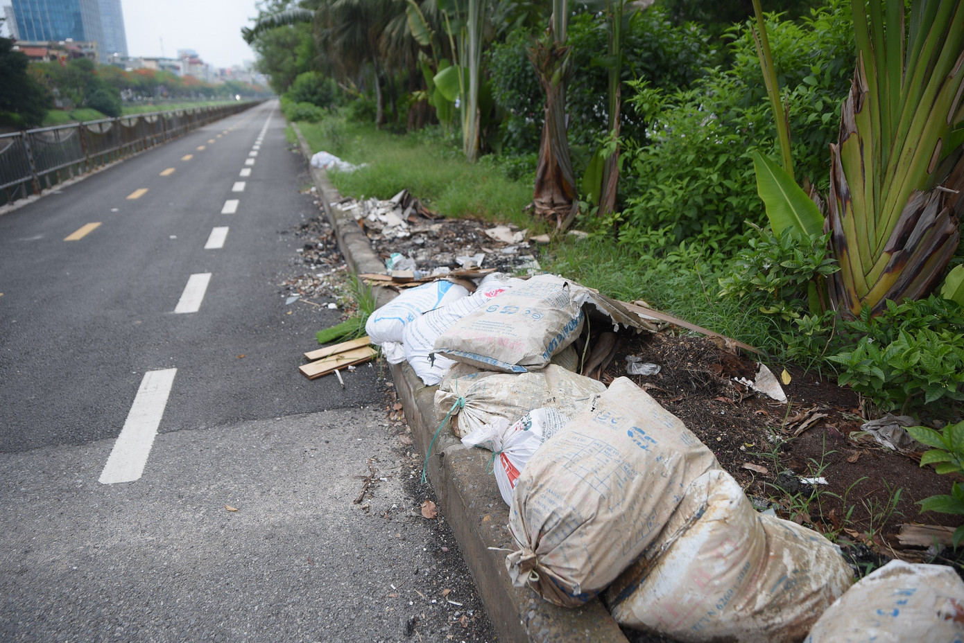 | Rác được chất cao, bốc mùi hôi thối nằm ngay bên mép tuyến đường dành cho người đi bộ, xe đạp. |