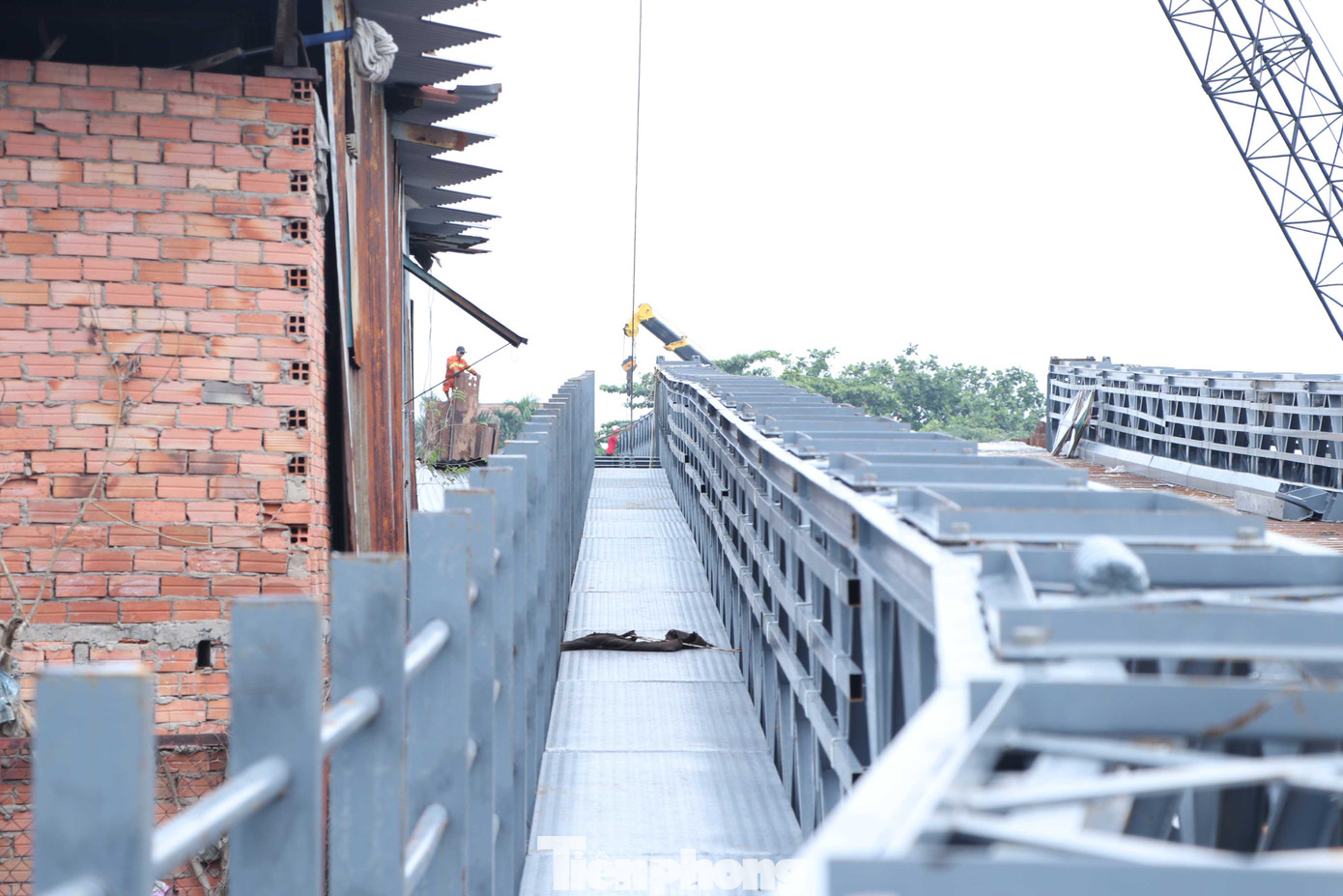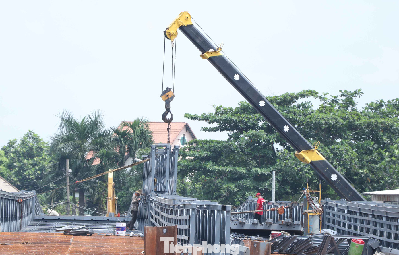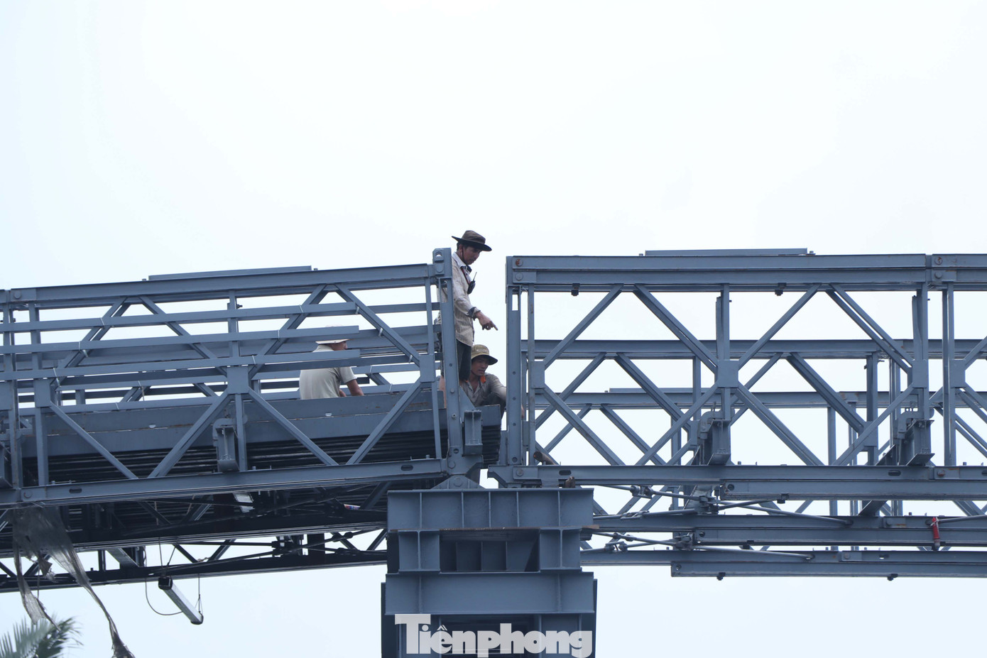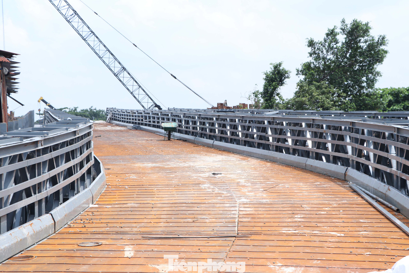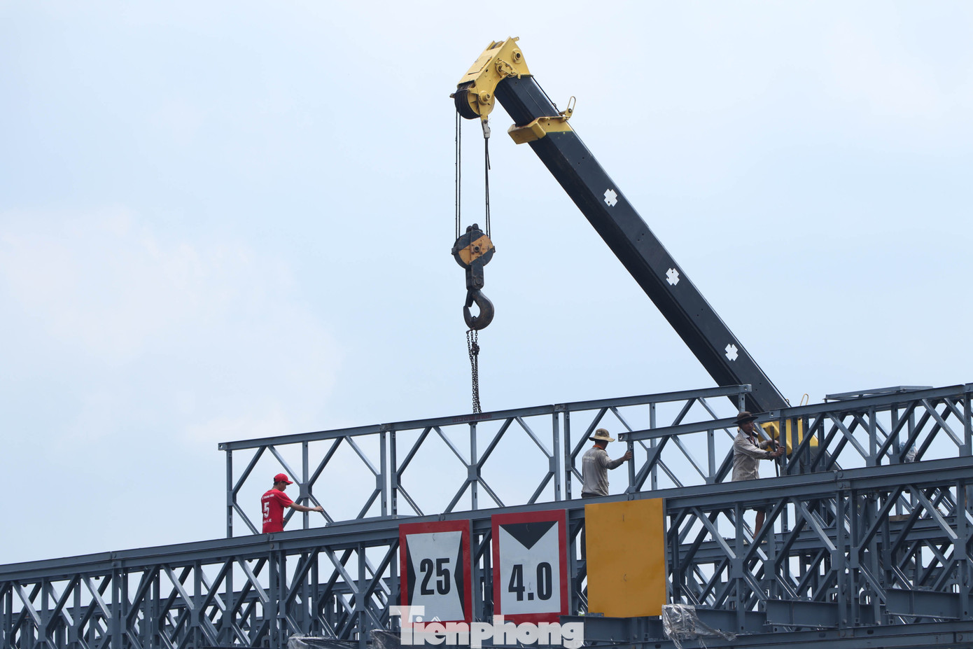 Ghi nhận của phóng viên, các đơn vị đang thực hiện ghép nối các nhịp cầu và kết cấu dầm sắt.