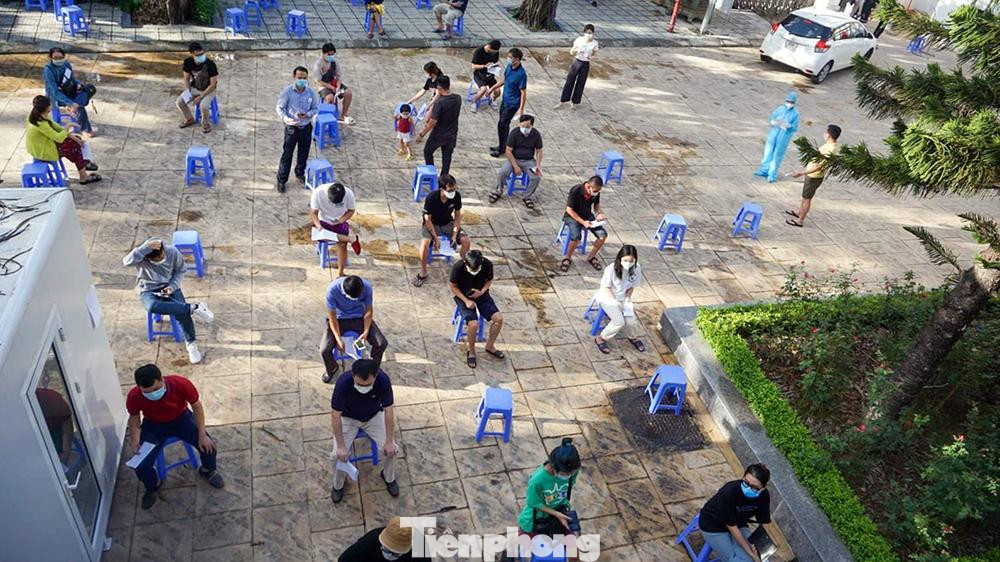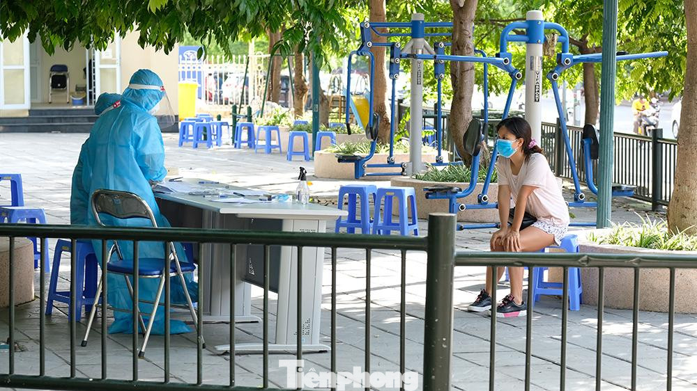 Tại quận Cầu Giấy, người dân đến làm xét nghiệm COVID-19 sẽ được xếp hàng đảm bảo giãn cách.