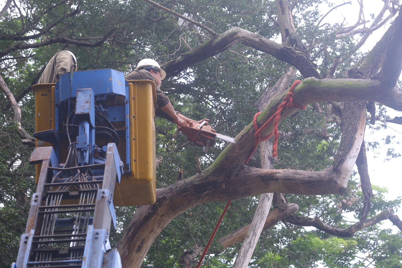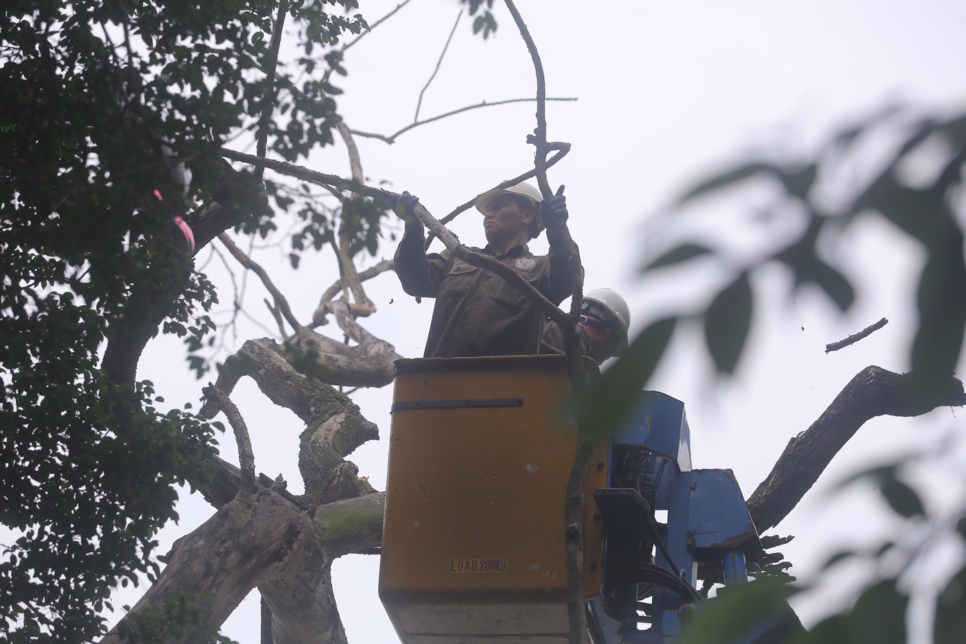 Hàng chục công nhân cùng với máy móc được huy động để chặt hạ cây sưa bên ven hồ Gươm vào sáng nay (24/5).
