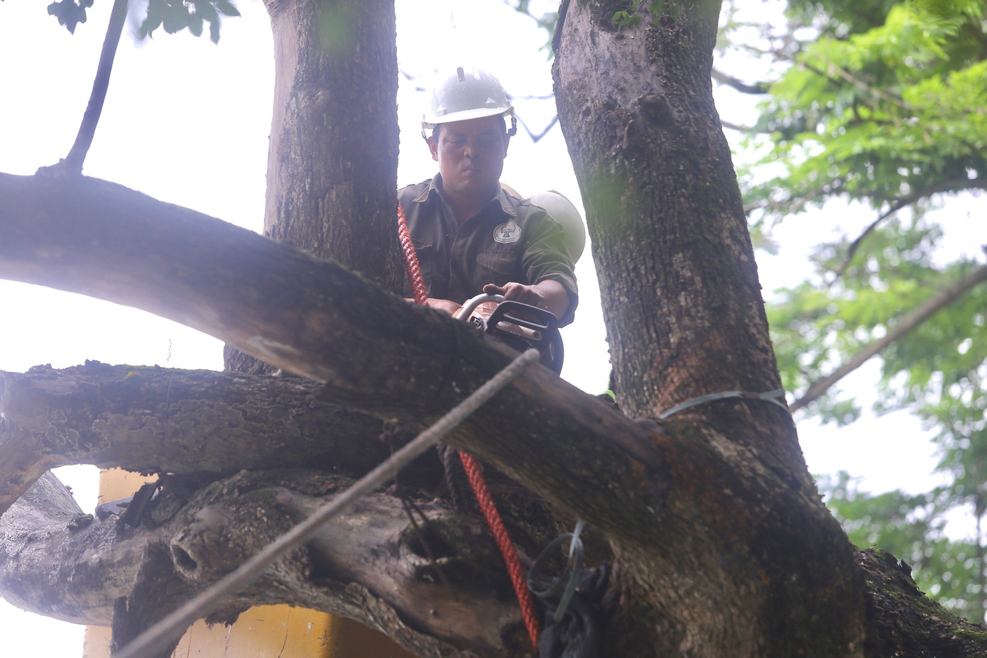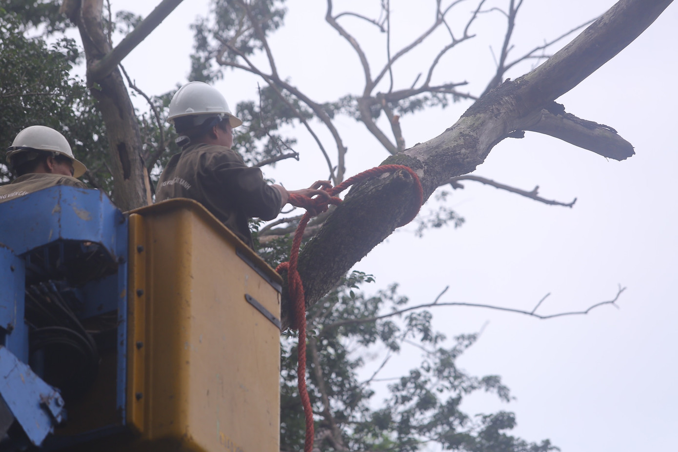 Những khúc cây lớn sau khi được cưa được hạ xuống từ từ, an toàn.