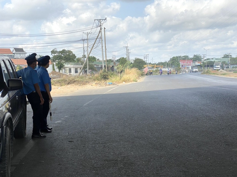 Tại cổng chào Tây Ninh, địa bàn giáp ranh với TPHCM, Thanh tra giao thông đội 7 phối hợp với đội Cảnh sát giao thông Tây Bắc chốt chặn, kiểm soát phương tiện từ Tây Ninh ra vào TPHCM. Ảnh: P. L.