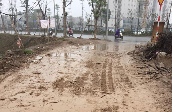 Phải gấp rút vay tiền nộp đúng hạn cho chủ đầu tư, nhưng khi về ở cư dân mới biết con đường rộng 40m nối với đường Hoàng Quốc Việt được quảng cáo do Thành phố làm chủ đầu tư vẫn đang thi công dang dở, chung cư mới chỉ "cao cấp" trên giấy.