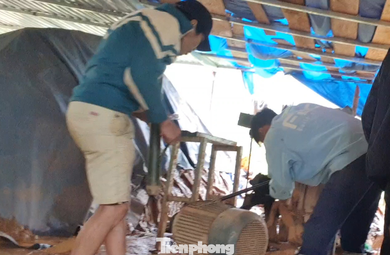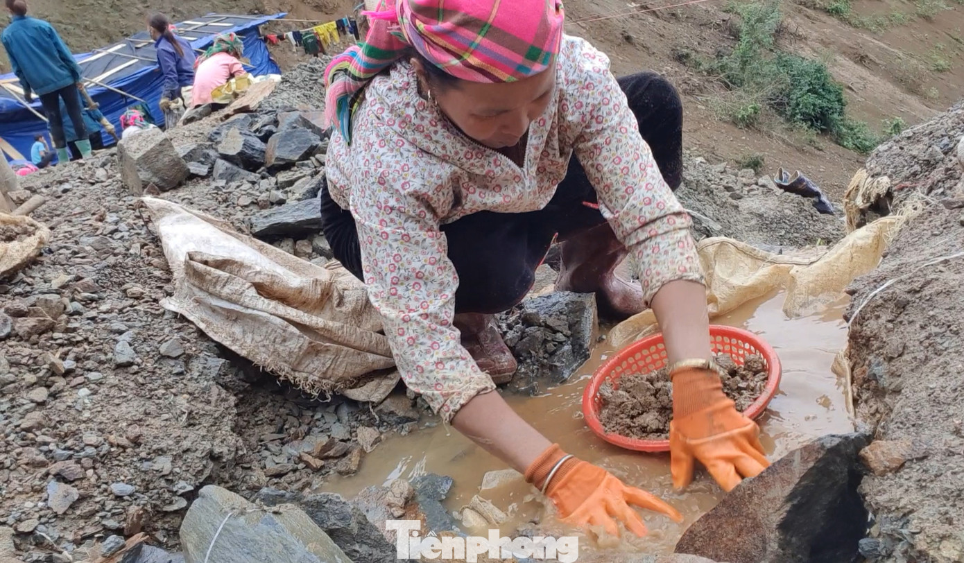Tại thời điểm chúng tôi có mặt, khoảng hơn 10 thanh niên đang vật vờ trong khu lán sinh hoạt chờ đến ca làm buổi tối. Còn phía khai trường, hàng chục con người khác cả đàn ông lẫn phụ nữ đang tấp nập đào xới, sàng đãi. Tiếng máy nổ, máy khoan vang vọng cả một góc rừng…