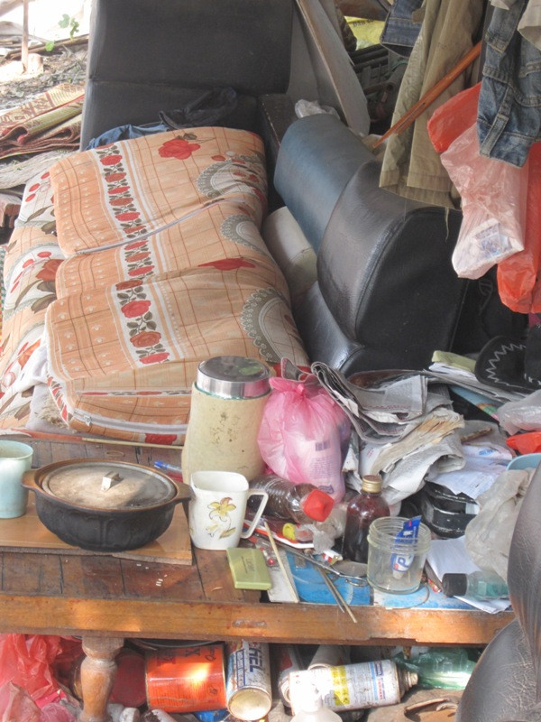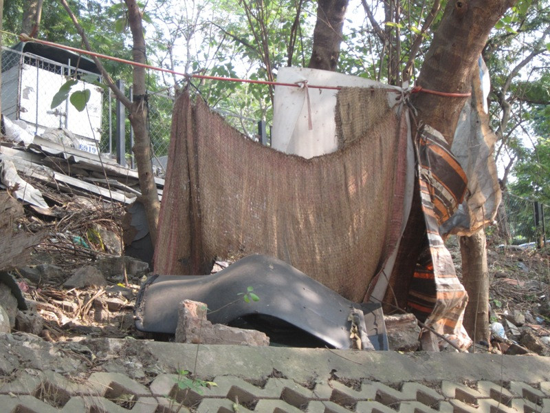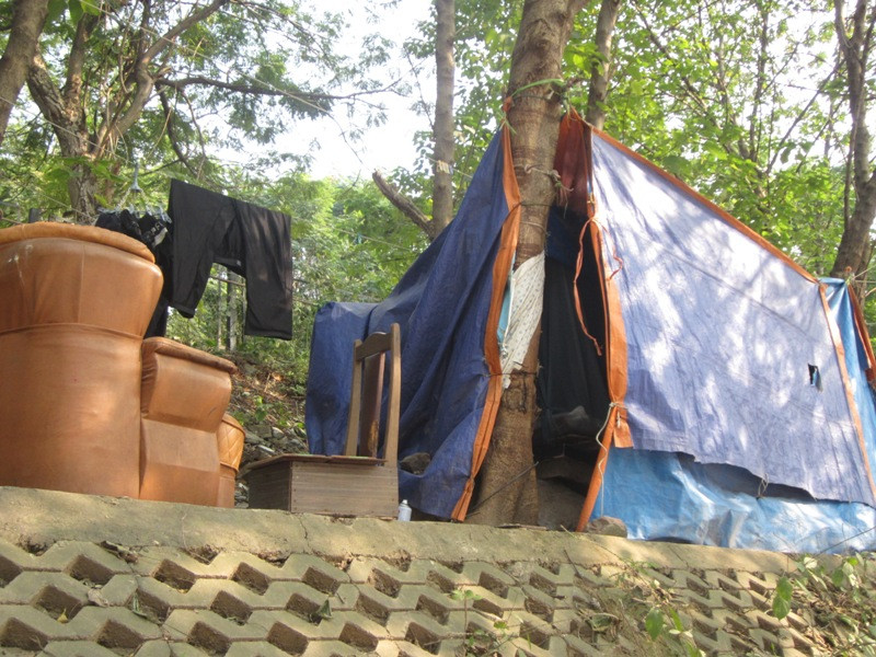 Họ sống trong những túp lều làm bằng bạt, những tấm ni lông rách rưới buộc tạm bợ vào những thân cây cách đường đi lại chỉ vài mét để che mưa nắng sống qua ngày. Hàng ngày, cả 3 người đàn ông đều đi từ sáng đến chiều tối mới về túp lều của mình.