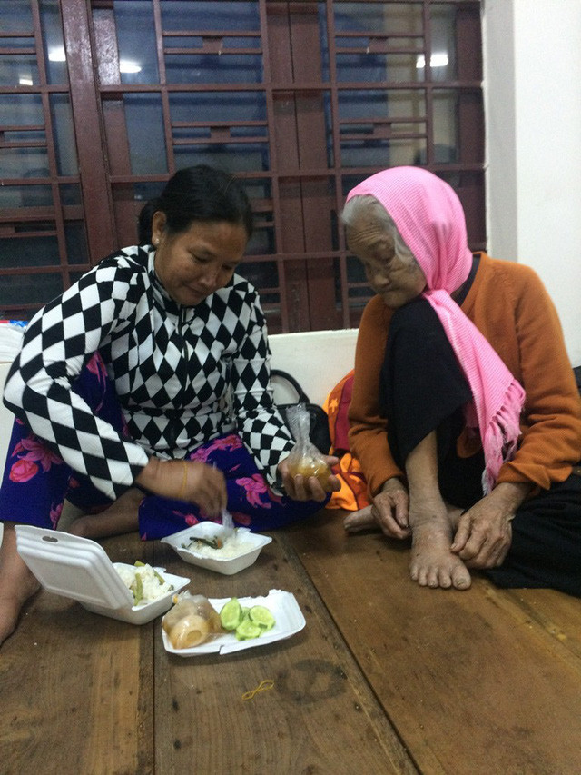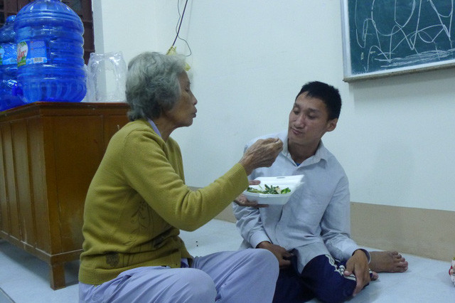 Bà Mum bón cơm cho cháu ngoại 26 tuổi bị tật nguyền từ nhỏ.