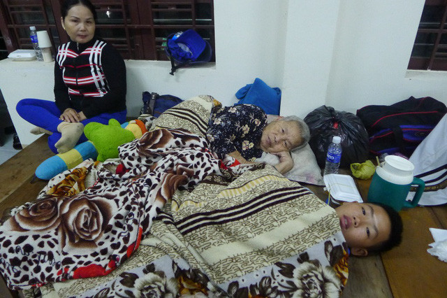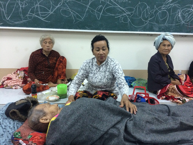 Chị Huỳnh Thị Yến cùng người cha 95 tuổi đang trú bão tại trường Cao đẳng sư phạm Kiên Giang kể, cha mẹ đều già, nhà cửa tạm bợ nên khi hay chính quyền thông báo sơ tán là vô đây liền. Từ chiều đến giờ, mưa gió lớn quá, chẳng biết ở nhà bây giờ thế nào nhưng bà con vào đây ở thì an tâm hơn nhiều so với ở nhà.