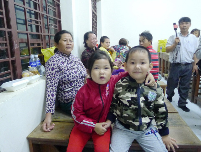 Hai cháu Võ Thị Ngọc Trinh và cháu Tôn Hòa Thông cùng bà ngoại vào trường Cao đẳng sư phạm Kiên Giang tránh bão khi cha mẹ đi làm ở Bình Dương.